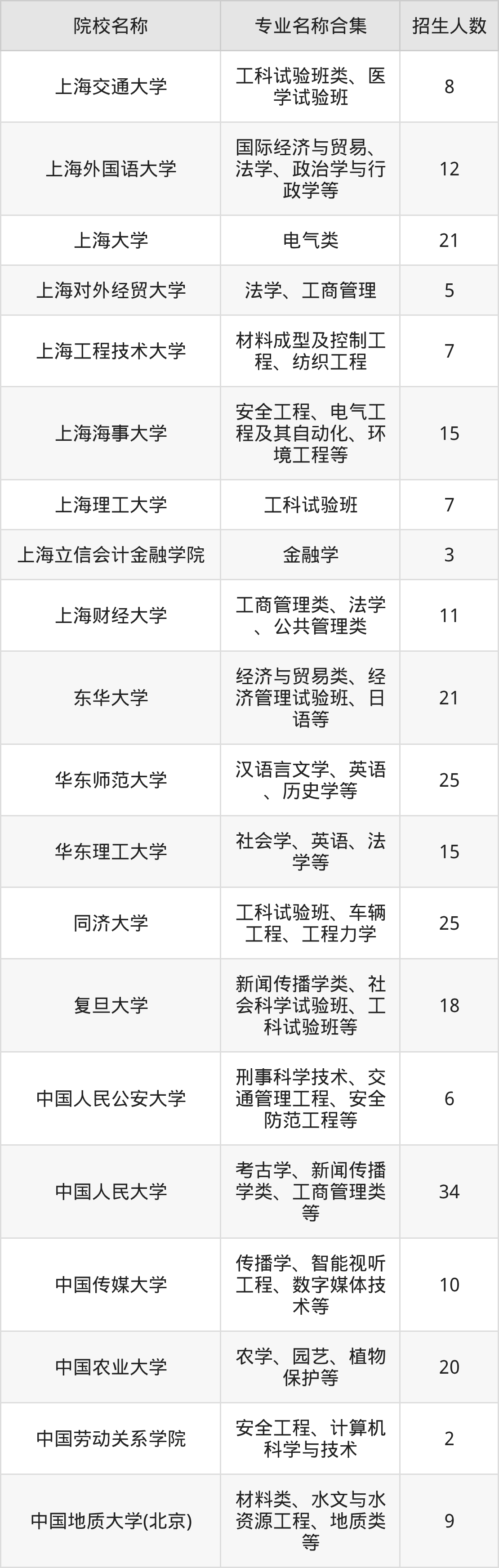 上海:上海交通大学、上海外国语大学、上海大学、上海对外经贸大学、上海工程技术大学、上海海事大学、上海理工大学、上海立信会计金融学院、上海财经大学、东华大学、华东师范大学、华东理工大学、同济大学、复旦大学