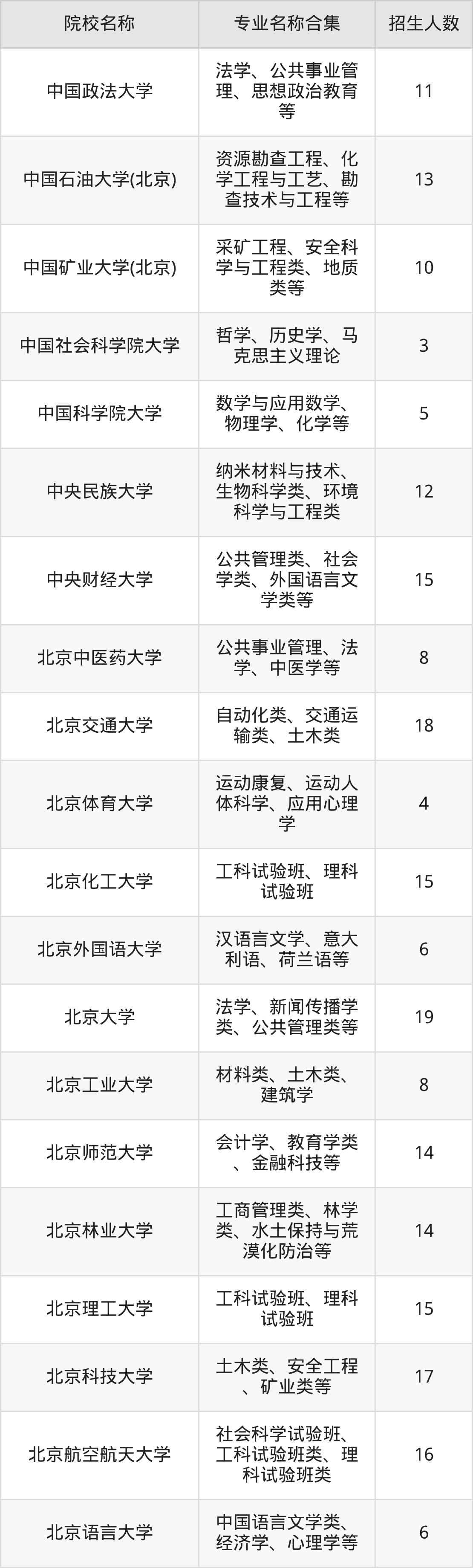 北京:中国人民公安大学、中国人民大学、中国传媒大学、中国农业大学、中国劳动关系学院、中国地质大学(北京)、中国政法大学、中国石油大学(北京)、中国矿业大学(北京)、中国社会科学院大学、中国科学院大学、中央民族大学、中央财经大学、北京中医药大学、北京交通大学、北京体育大学、北京化工大学、北京外国语大学、北京大学、北京工业大学、北京师范大学、北京林业大学、北京理工大学、北京科技大学、北京航空航天大学、北京语言大学、北京邮电大学、华北电力大学、外交学院、对外经济贸易大学、清华大学、首都医科大学、首都师范大学、首都经济贸易大学