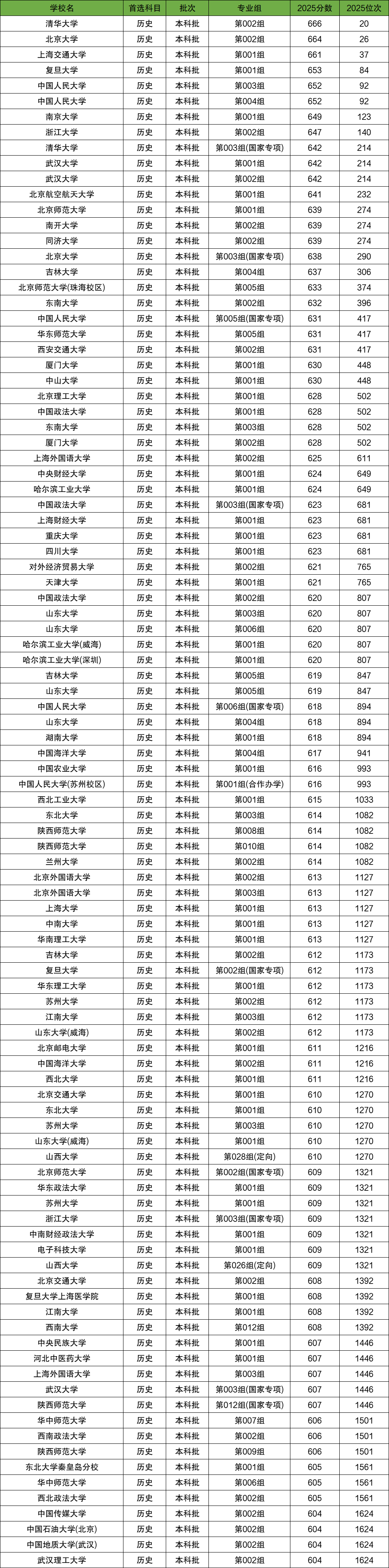 下面是2025年在山西省历史类录取分数线及位次排名前百强高校一览表: