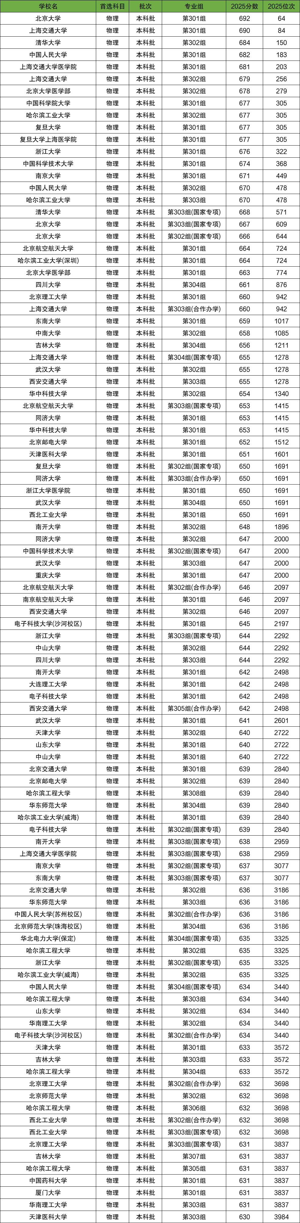 下面是2025年在山西省物理类录取分数线及位次排名前百强高校一览表: