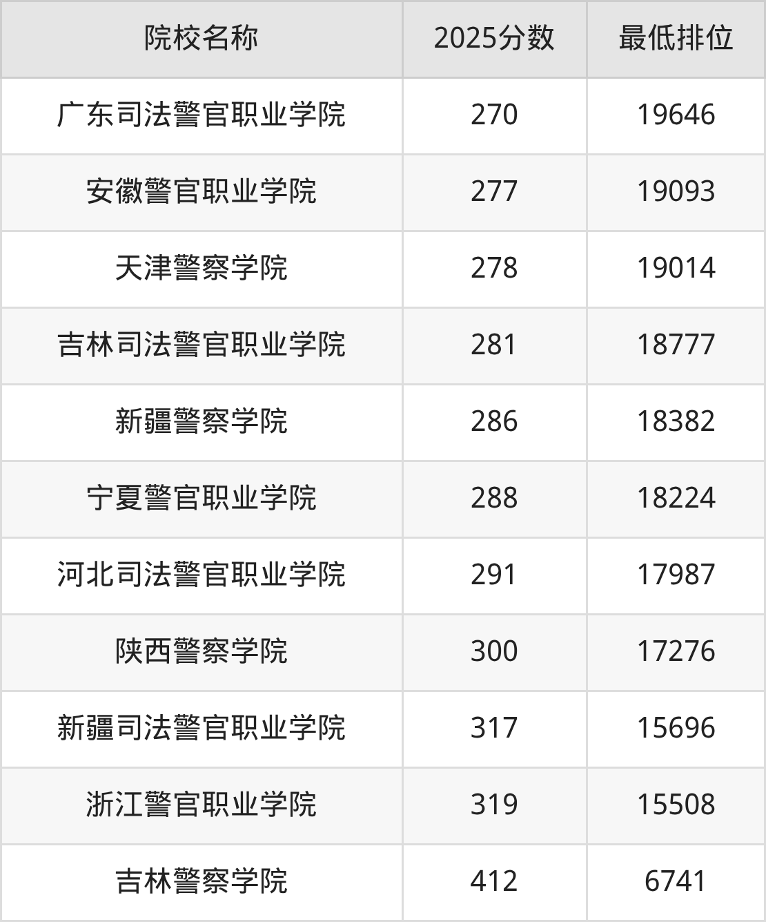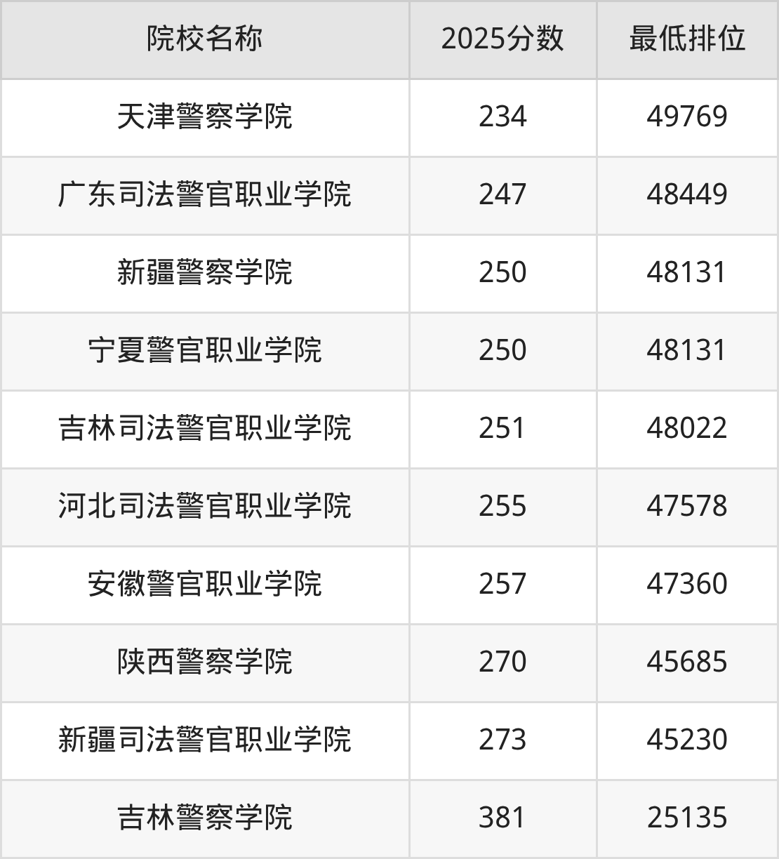 第二梯队(241-379分):广东司法警官职业学院(247分)、新疆警察学院(250分)、宁夏警官职业学院(250分)、吉林司法警官职业学院(251分)