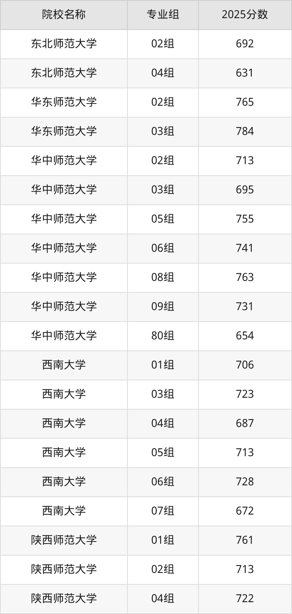 第二梯队(641-779分):东北师范大学(02组是692分)、华东师范大学(02组是765分)、华中师范大学(02组是713分)、华中师范大学(03组是695分)