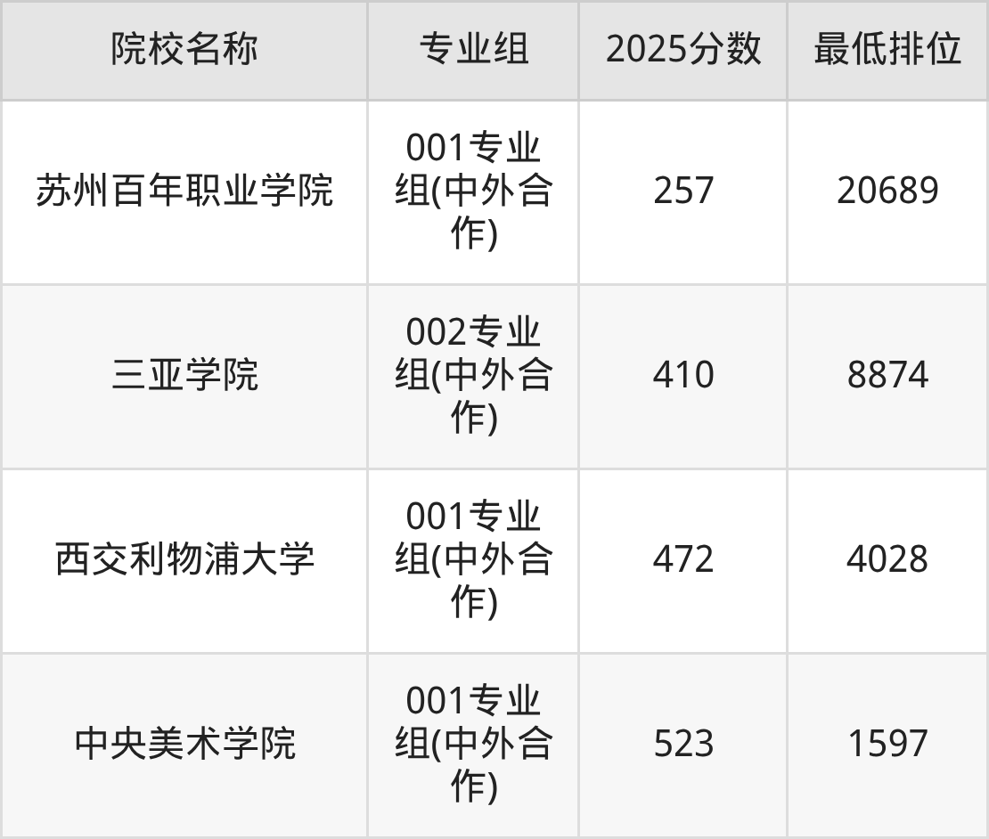 第二梯队(261-519分):三亚学院(002专业组(中外合作)是410分)、西交利物浦大学(001专业组(中外合作)是472分)