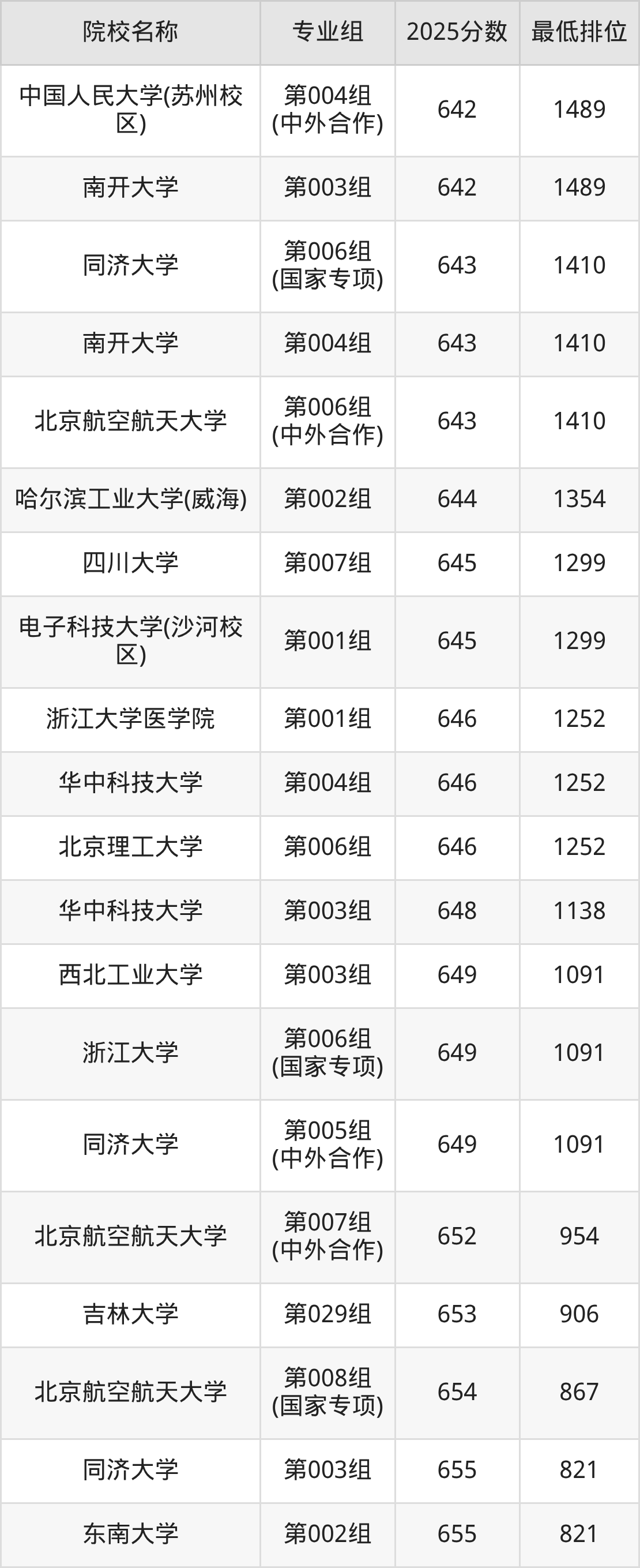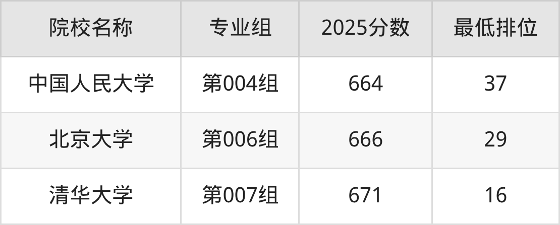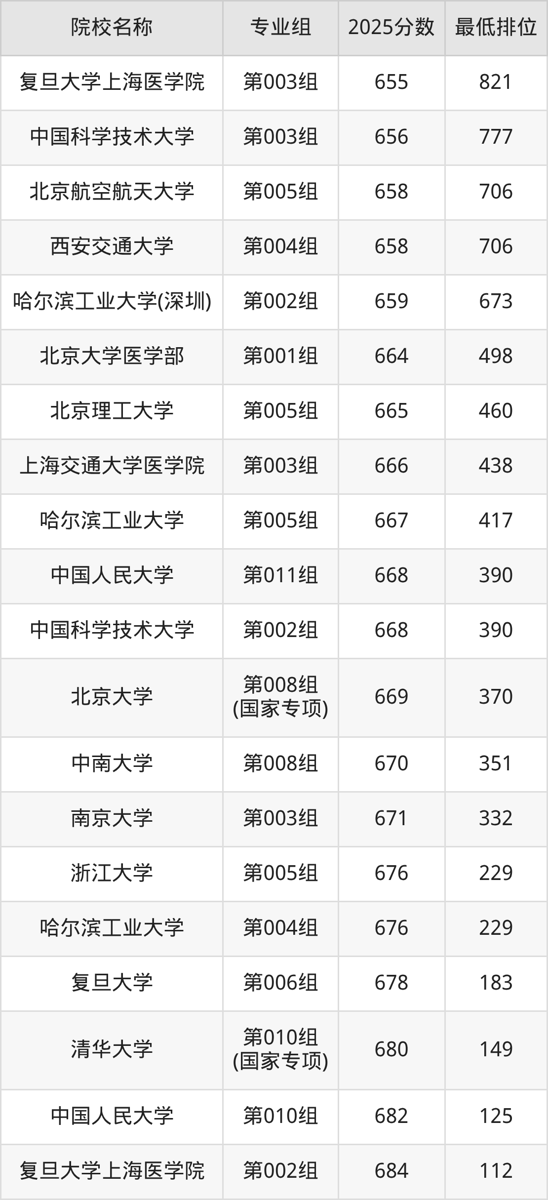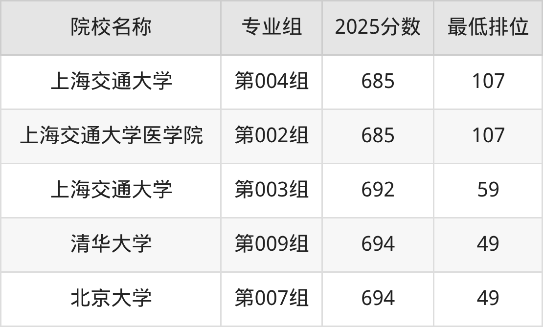 第一梯队(690分+):上海交通大学(第003组是692分)、清华大学(第009组是694分)、北京大学(第007组是694分)