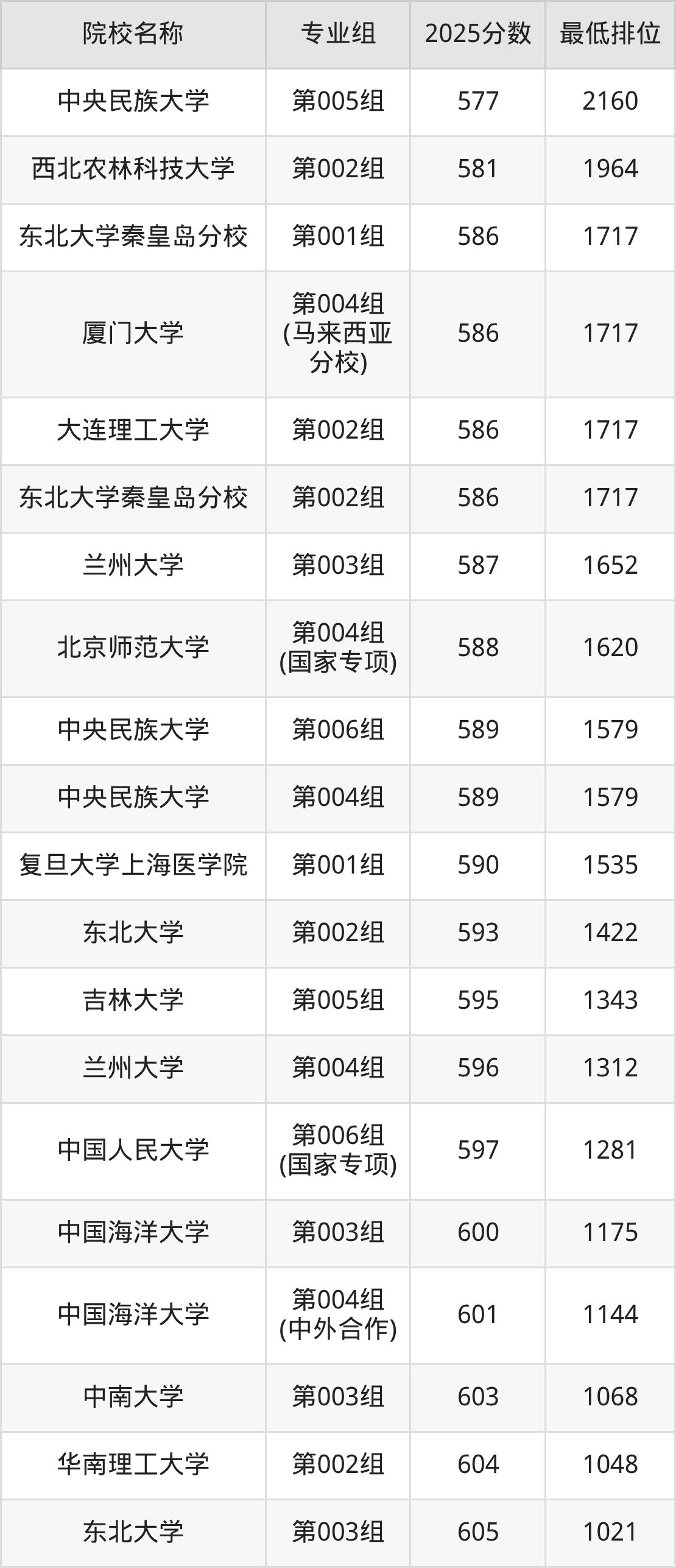 第三梯队(580分及以下):中央民族大学(第005组是577分)