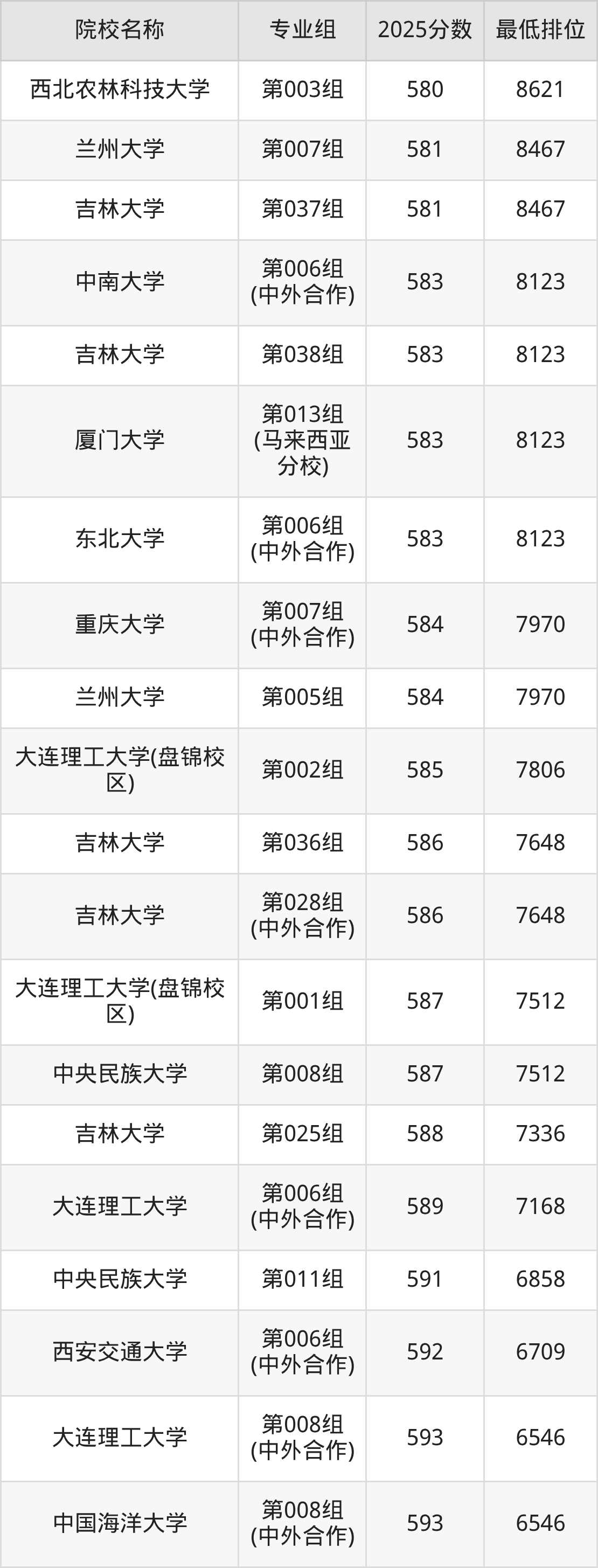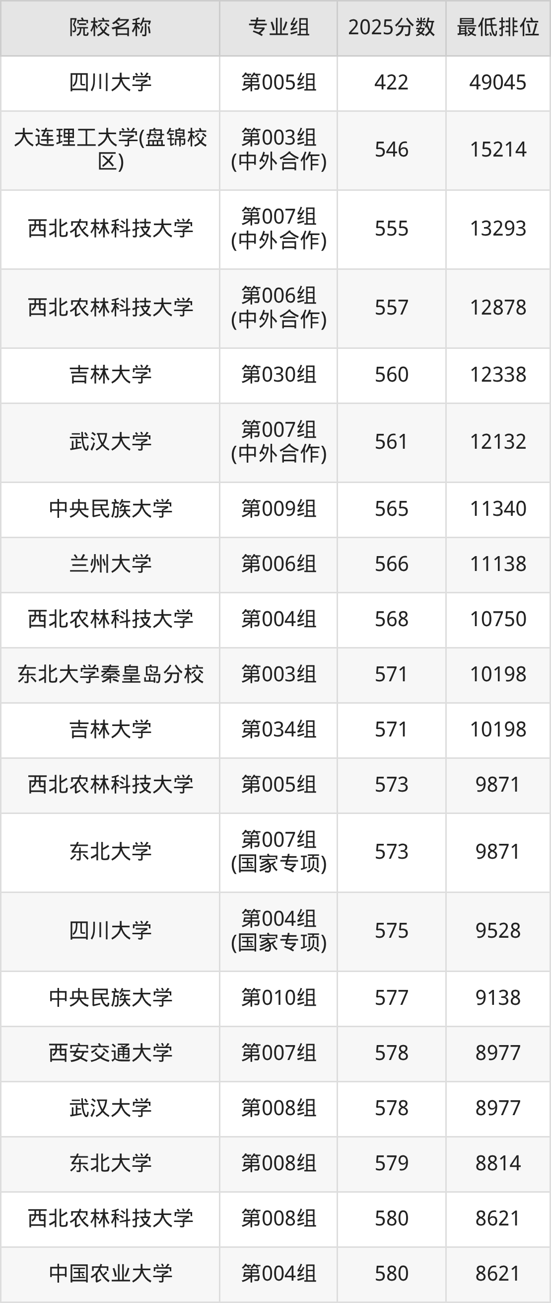 第二梯队(431-689分):大连理工大学(盘锦校区)(第003组(中外合作)是546分)、西北农林科技大学(第007组(中外合作)是555分)、西北农林科技大学(第006组(中外合作)是557分)、吉林大学(第030组是560分)