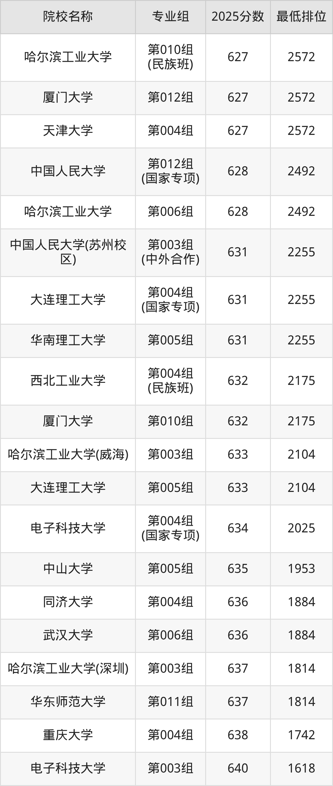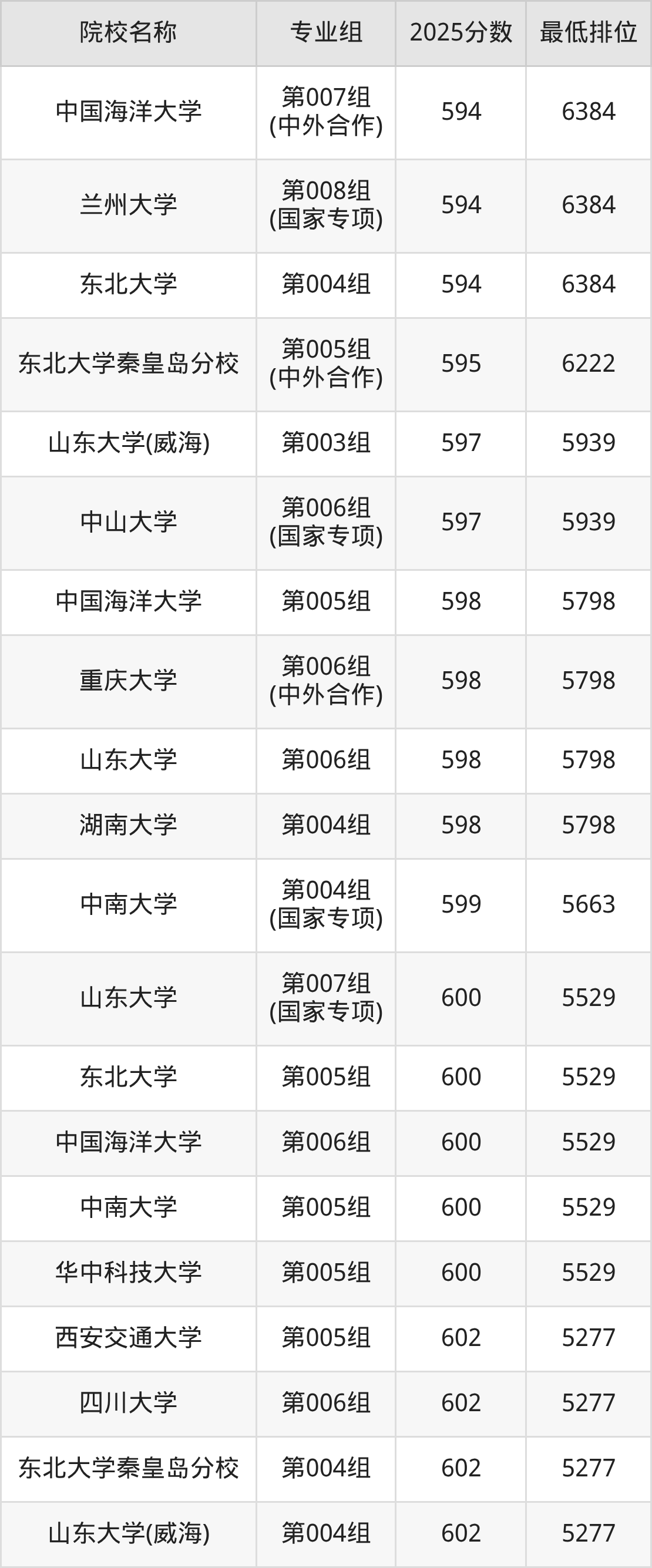 第二梯队(581-669分):西北农林科技大学(第002组是581分)、东北大学秦皇岛分校(第001组是586分)、厦门大学(第004组(马来西亚分校)是586分)、大连理工大学(第002组是586分)