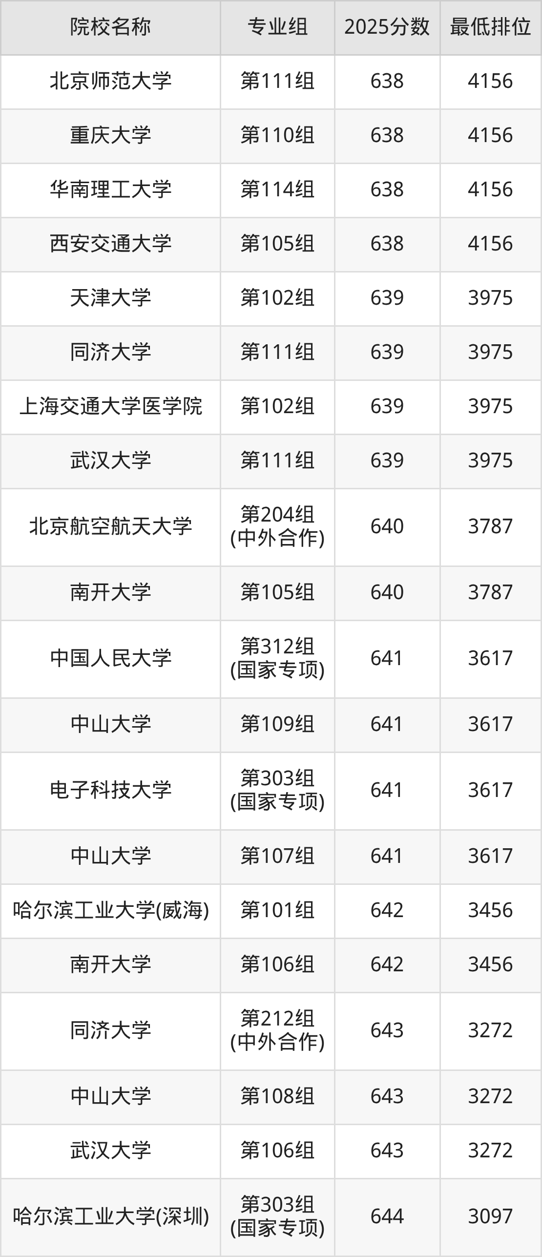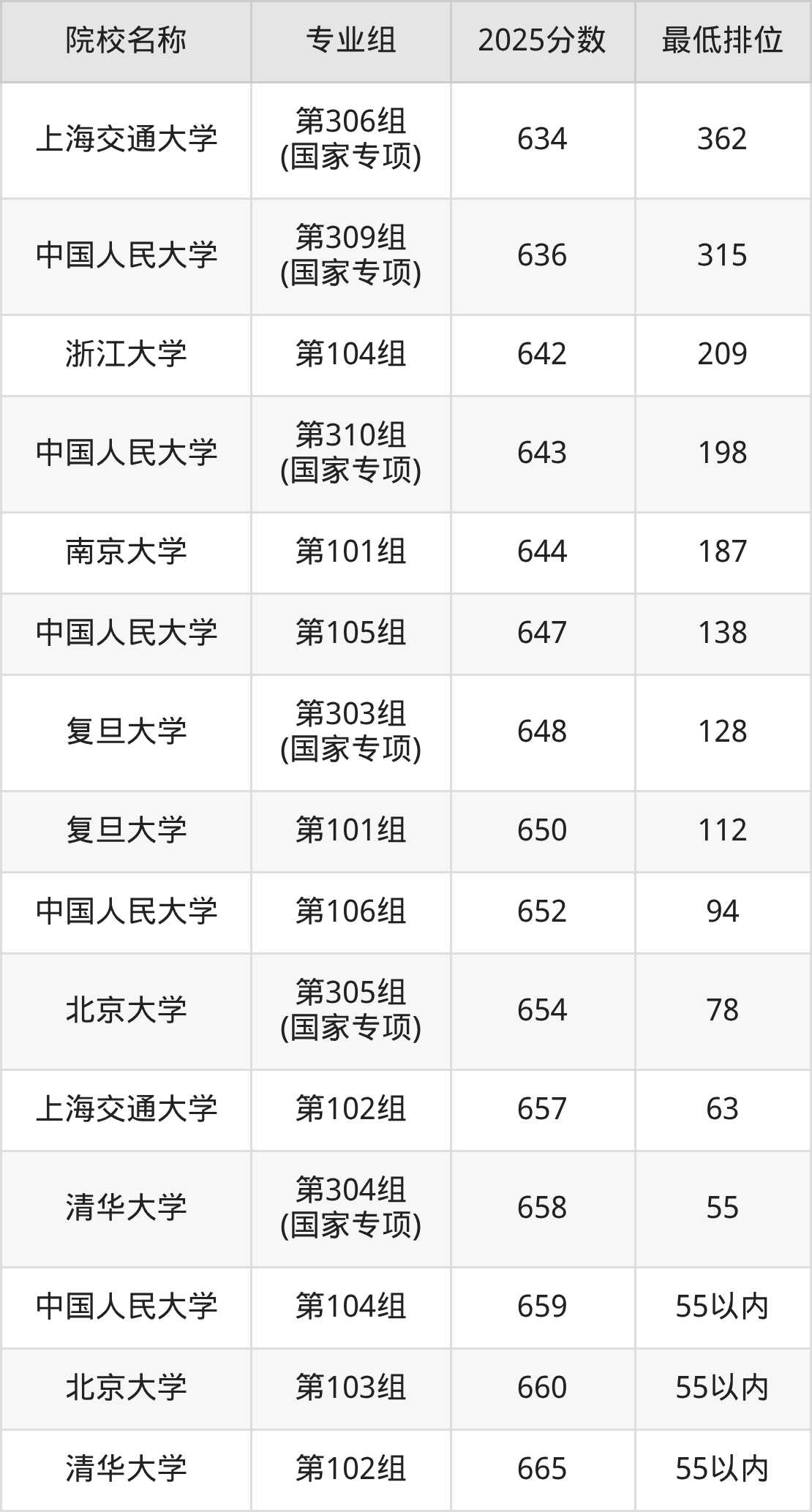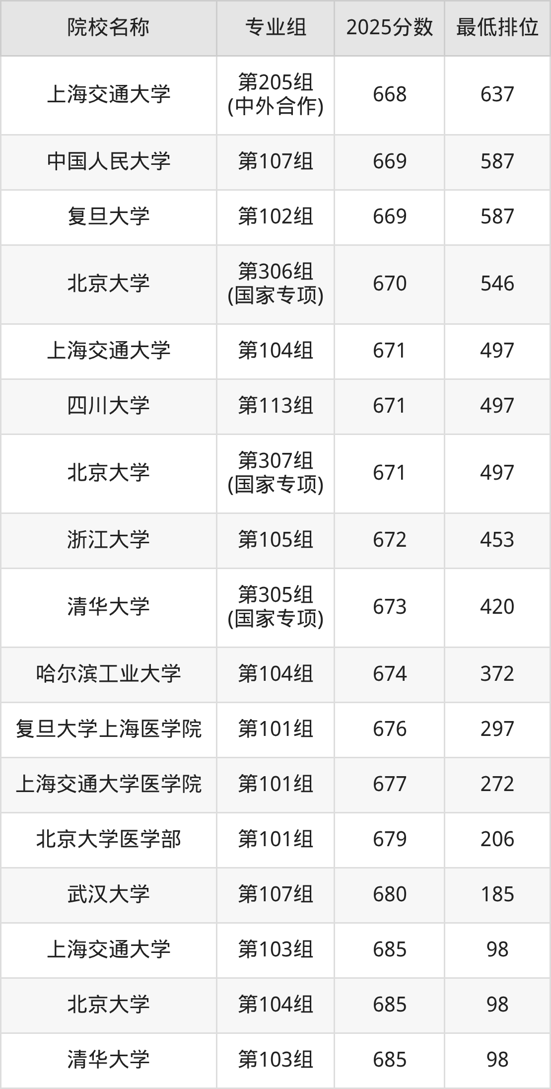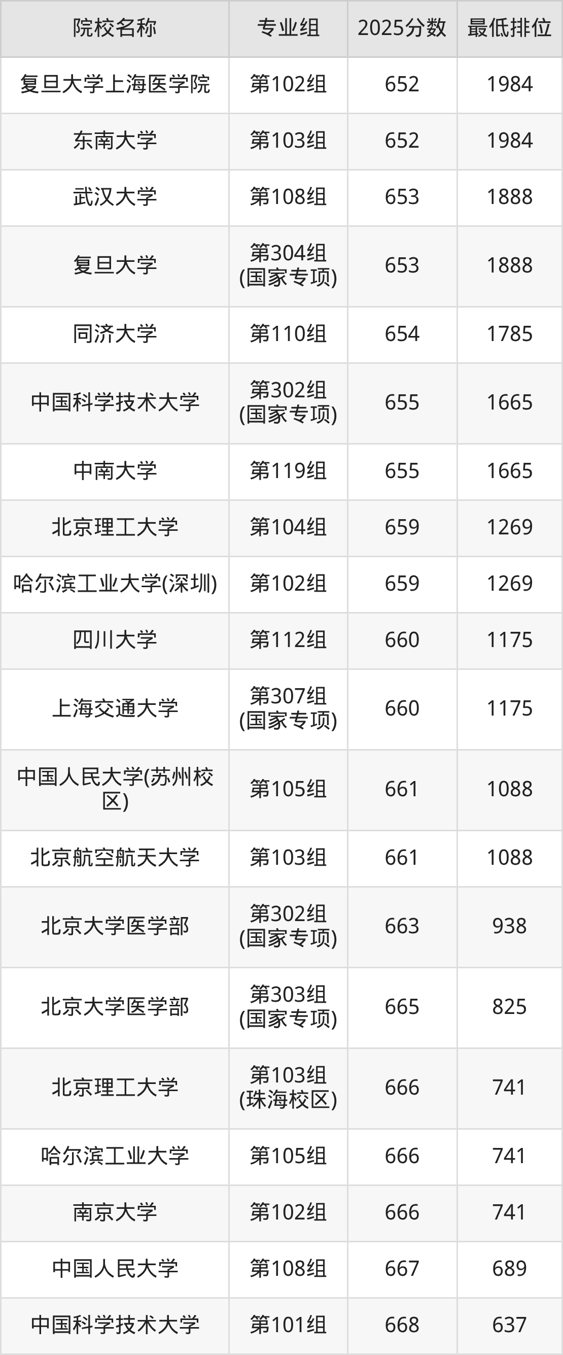 第一梯队(660分+):北京大学(第103组是660分)、清华大学(第102组是665分)