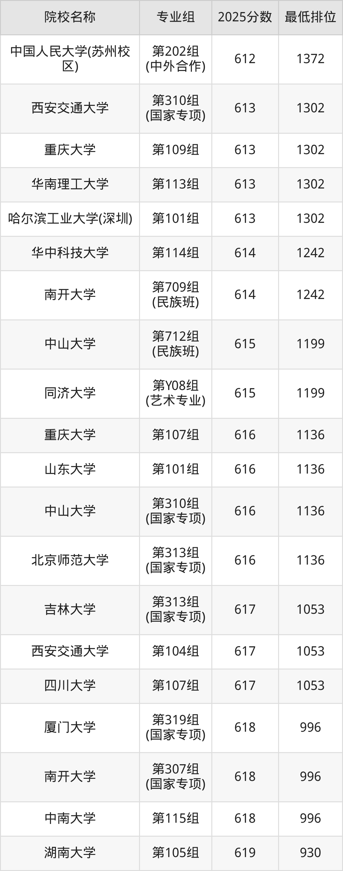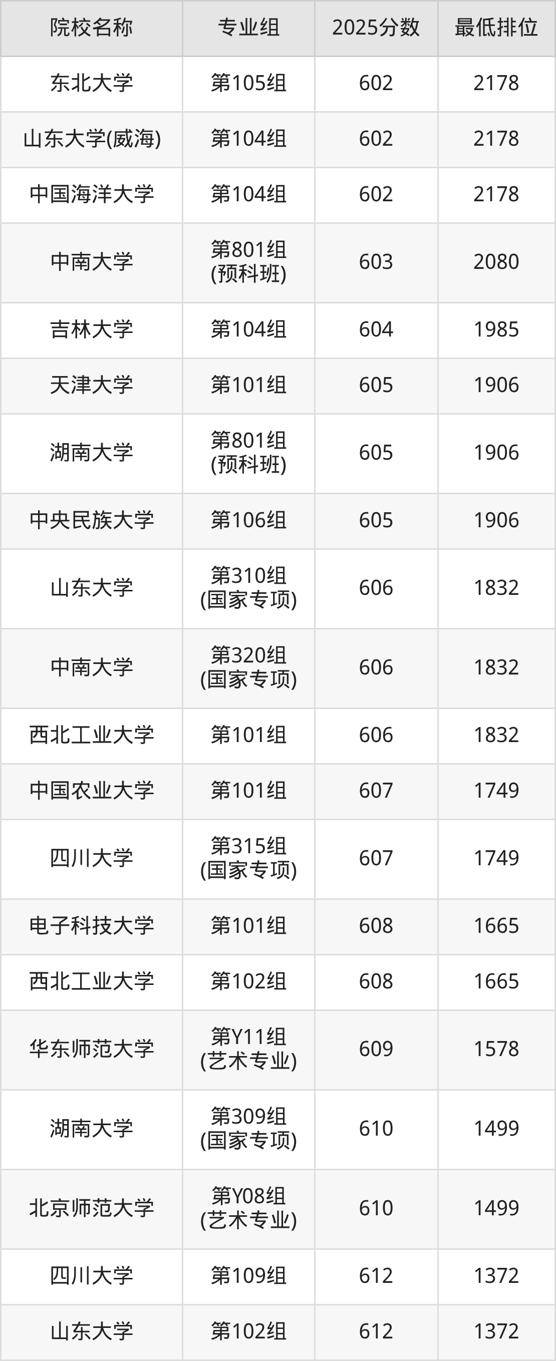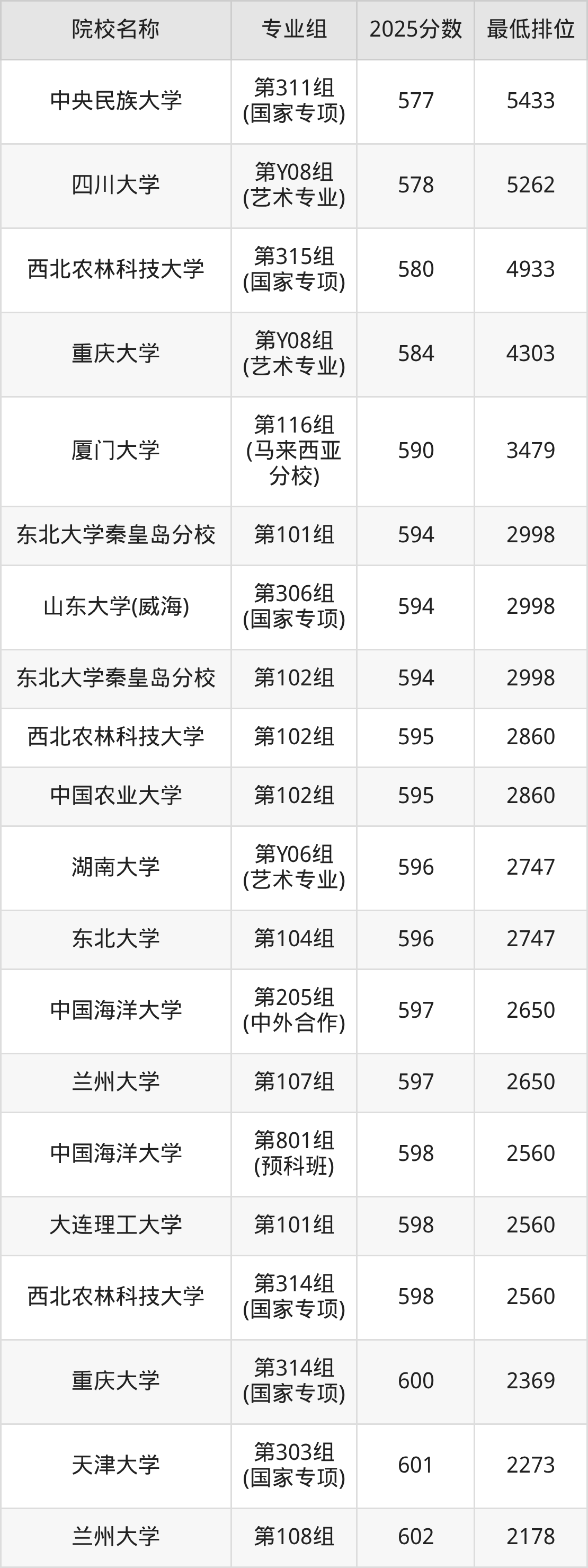 第三梯队(580分及以下):中央民族大学(第311组(国家专项)是577分)、四川大学(第Y08组(艺术专业)是578分)、西北农林科技大学(第315组(国家专项)是580分)