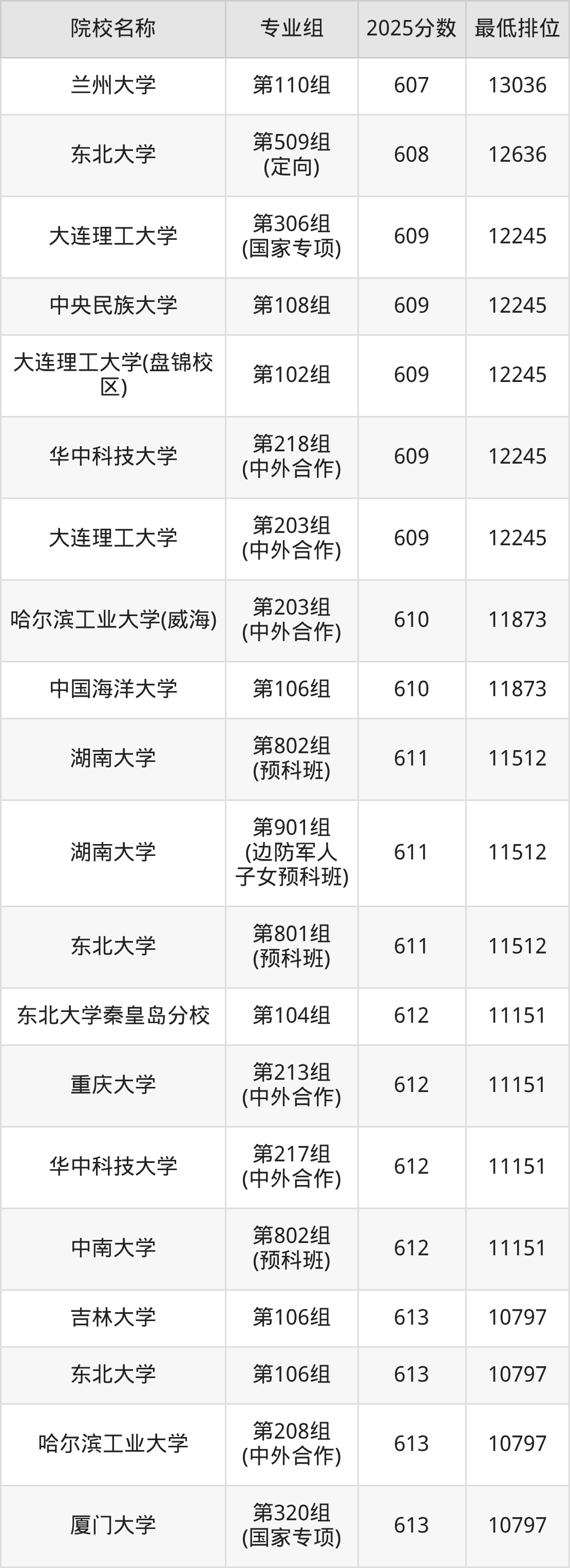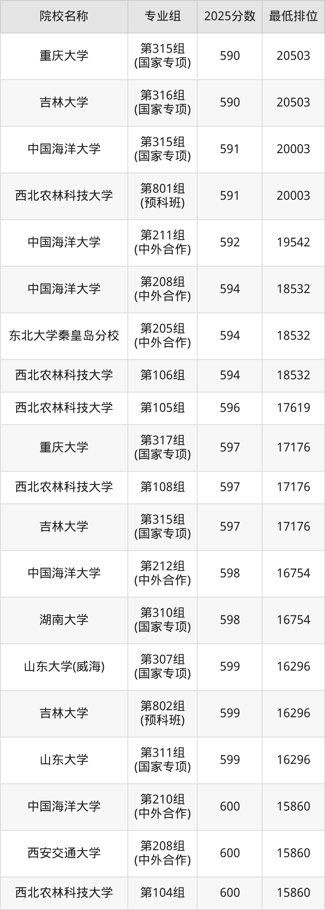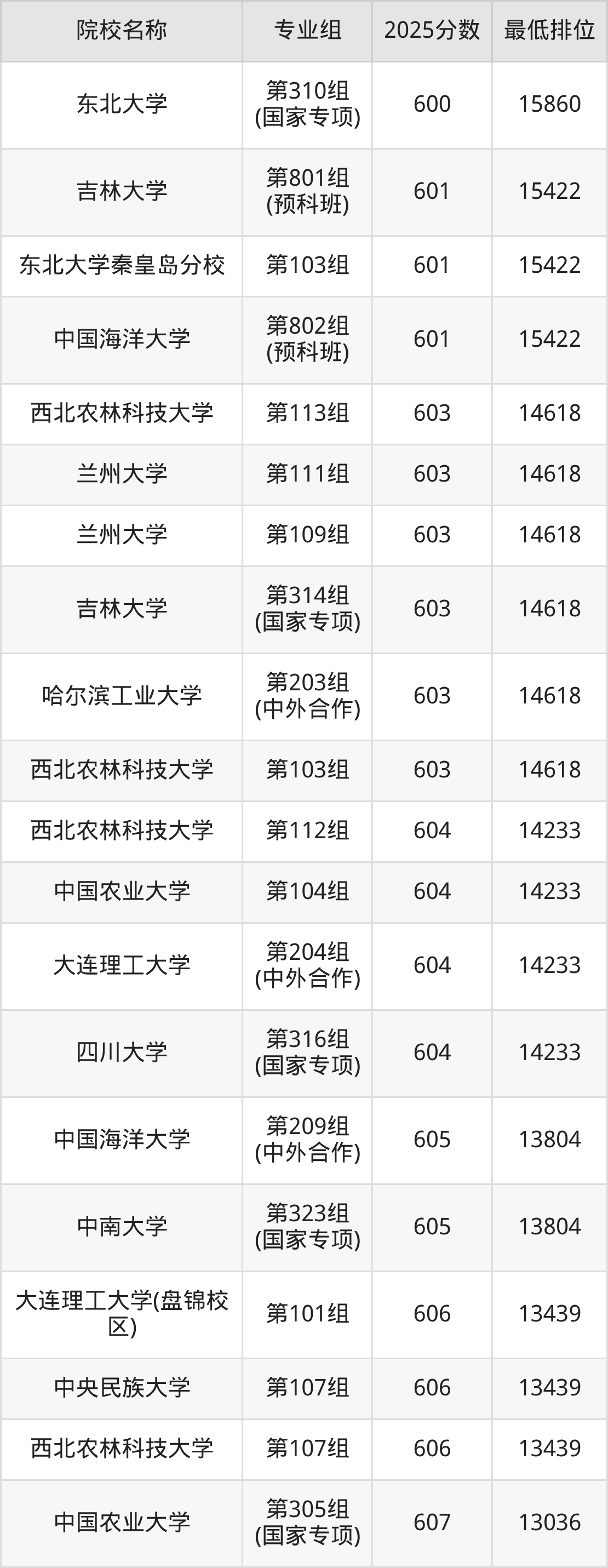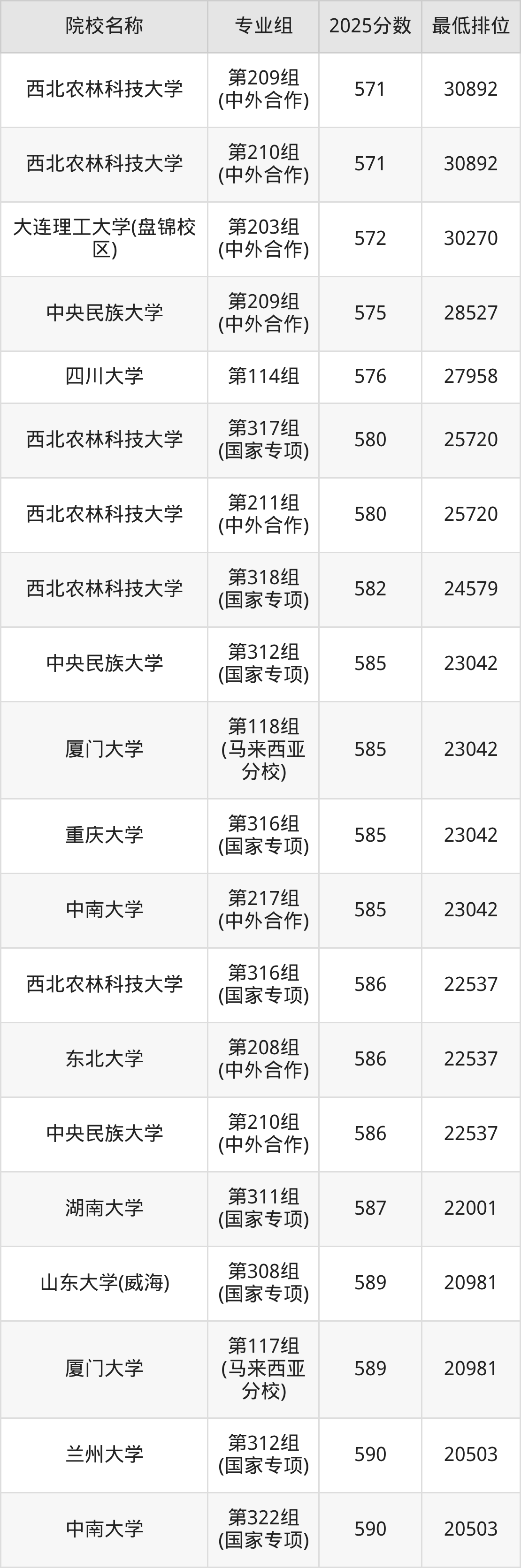 第三梯队(580分及以下):西北农林科技大学(第209组(中外合作)是571分)、西北农林科技大学(第210组(中外合作)是571分)、大连理工大学(盘锦校区)(第203组(中外合作)是572分)、中央民族大学(第209组(中外合作)是575分)