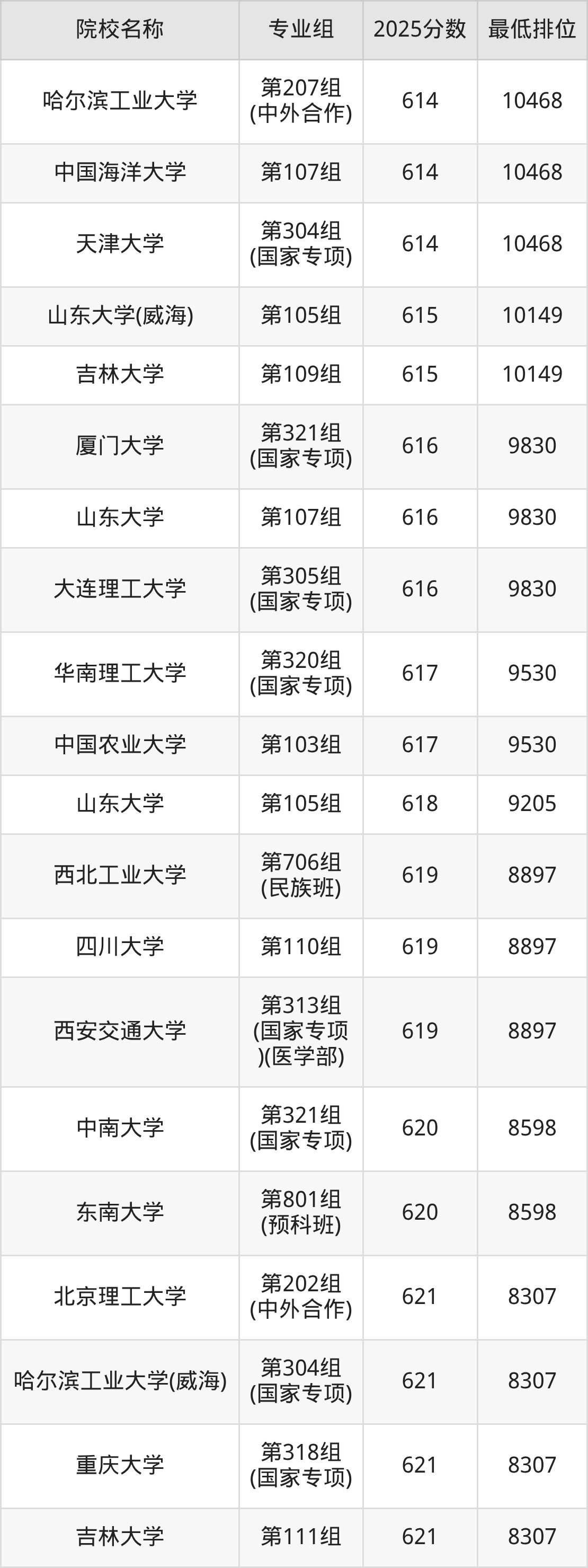 第二梯队(581-659分):重庆大学(第Y08组(艺术专业)是584分)、厦门大学(第116组(马来西亚分校)是590分)、东北大学秦皇岛分校(第101组是594分)、山东大学(威海)(第306组(国家专项)是594分)
