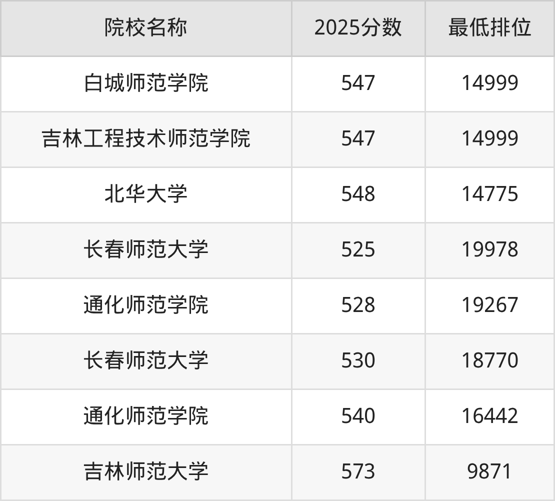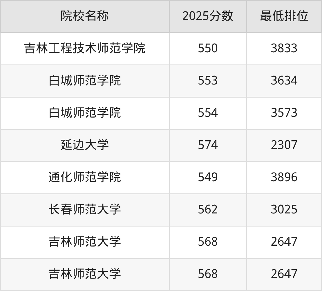 第三梯队(550分及以下):吉林工程技术师范学院(550分)、通化师范学院(549分)