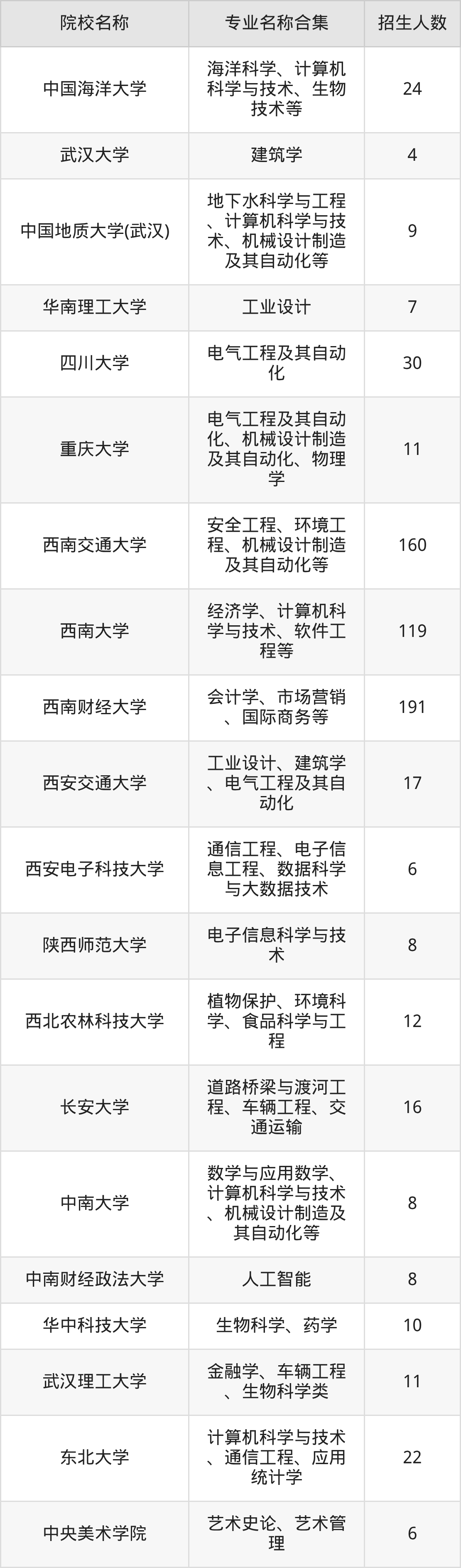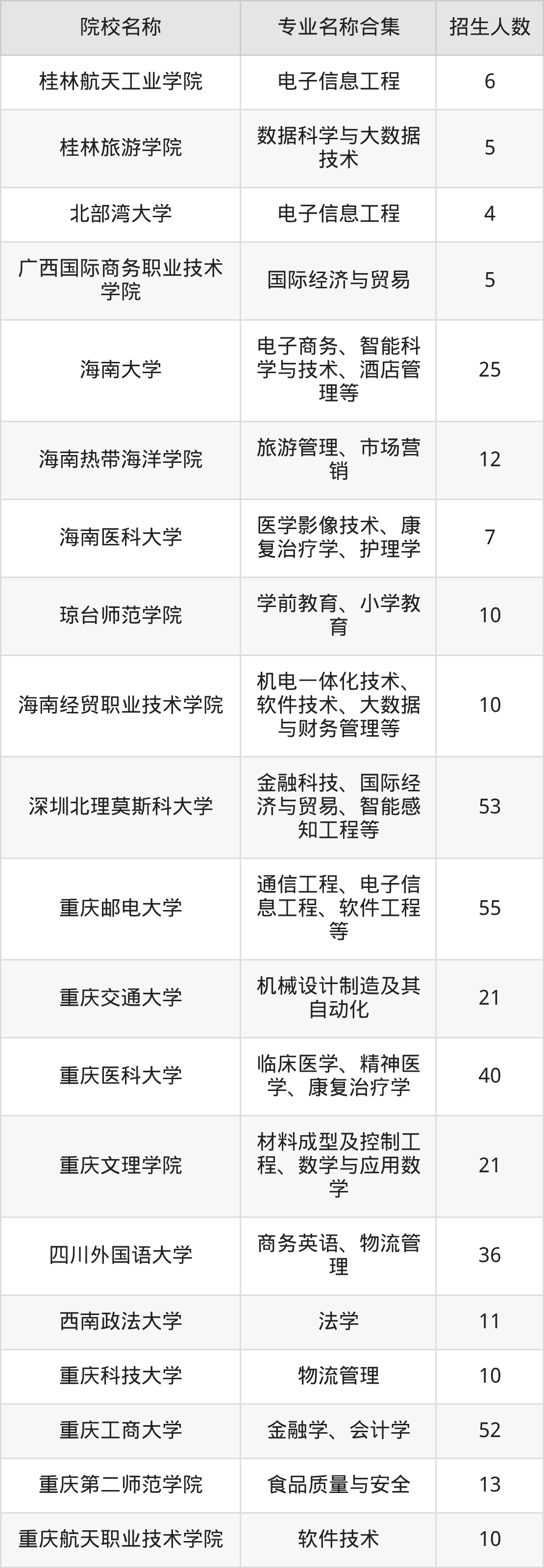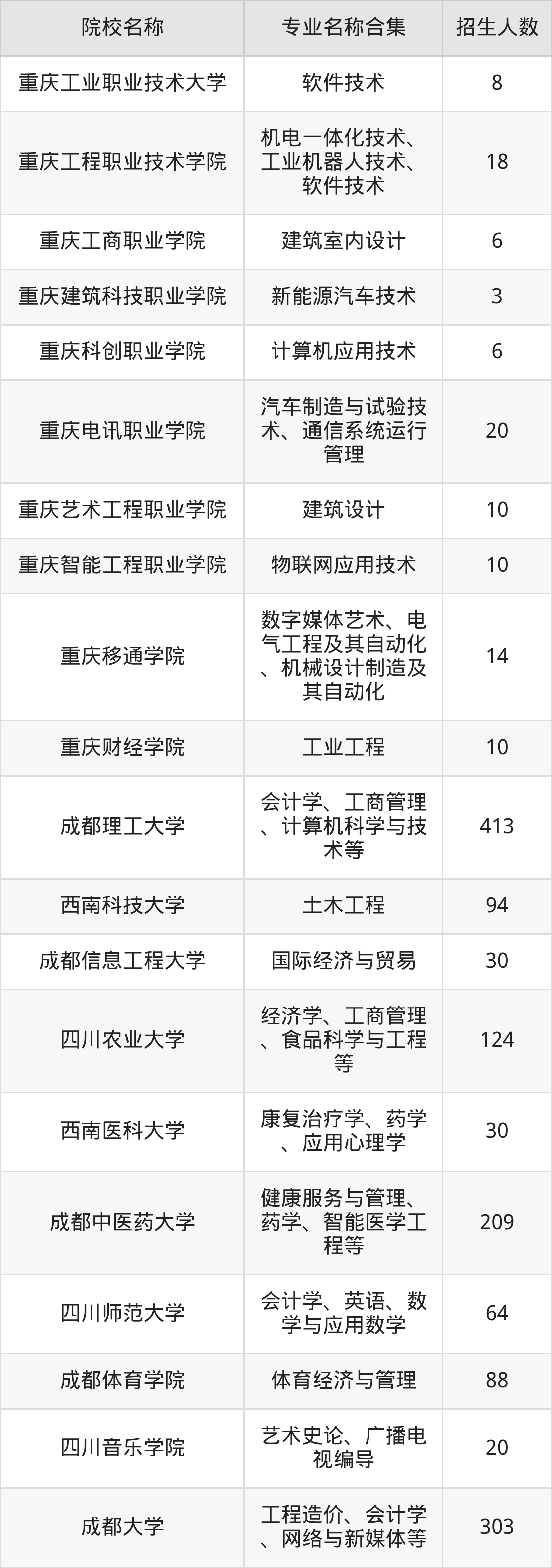 重庆:重庆大学、西南大学、重庆邮电大学、重庆交通大学、重庆医科大学、重庆文理学院、四川外国语大学、西南政法大学、重庆科技大学、重庆工商大学、重庆第二师范学院、重庆航天职业技术学院、重庆工业职业技术大学、重庆工程职业技术学院、重庆工商职业学院、重庆建筑科技职业学院、重庆科创职业学院、重庆电讯职业学院、重庆艺术工程职业学院、重庆智能工程职业学院、重庆移通学院、重庆财经学院