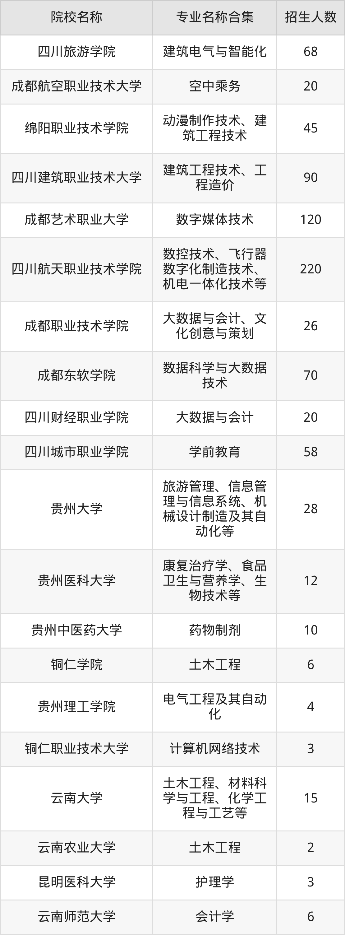 四川:四川大学、西南交通大学、西南财经大学、电子科技大学、成都理工大学、西南科技大学、成都信息工程大学、四川农业大学、西南医科大学、成都中医药大学、四川师范大学、成都体育学院、四川音乐学院、成都大学、四川旅游学院、成都航空职业技术大学、绵阳职业技术学院、四川建筑职业技术大学、成都艺术职业大学、四川航天职业技术学院、成都职业技术学院、成都东软学院、四川财经职业学院、四川城市职业学院、成都工业职业技术学院