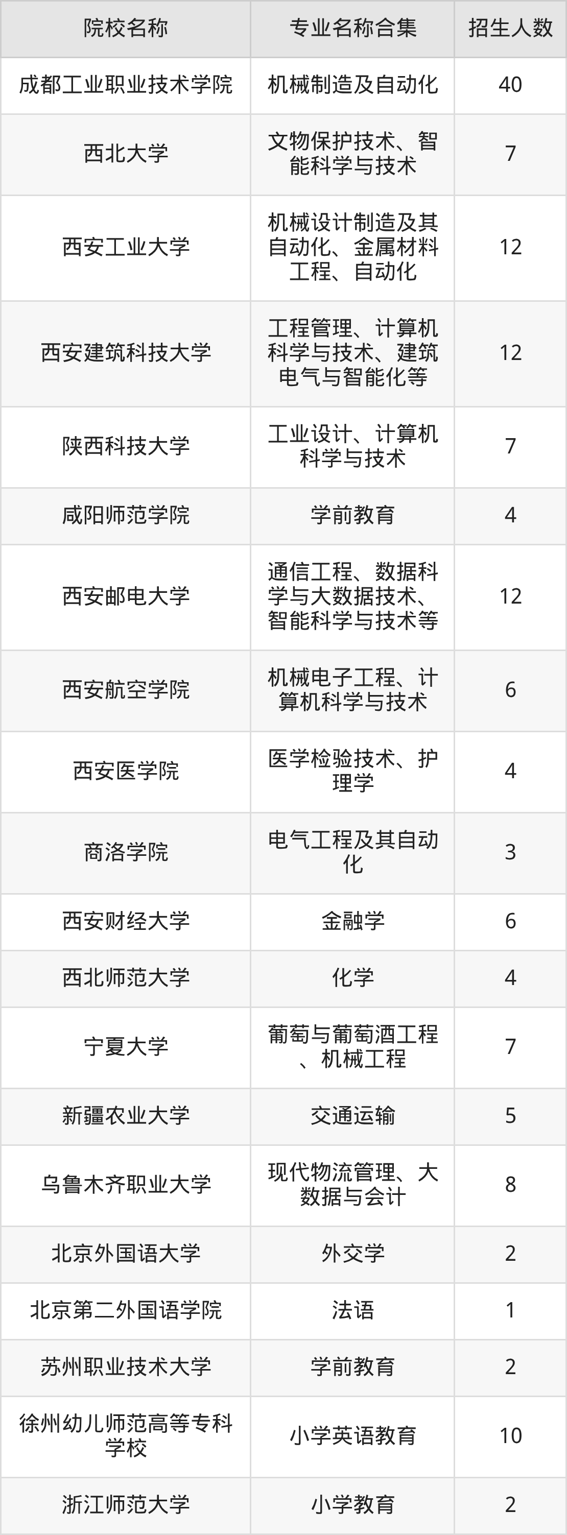 陕西:西安交通大学、西安电子科技大学、陕西师范大学、西北农林科技大学、长安大学、西北工业大学、西北大学、西安工业大学、西安建筑科技大学、陕西科技大学、咸阳师范学院、西安邮电大学、西安航空学院、西安医学院、商洛学院、西安财经大学、渭南师范学院