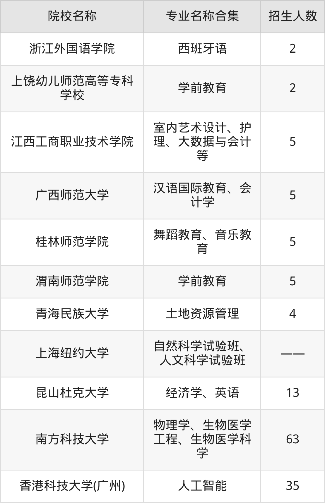 江西:华东交通大学、江西财经大学、南昌大学、江西医学高等专科学校、江西水利电力大学、豫章师范学院、上饶幼儿师范高等专科学校、江西工商职业技术学院