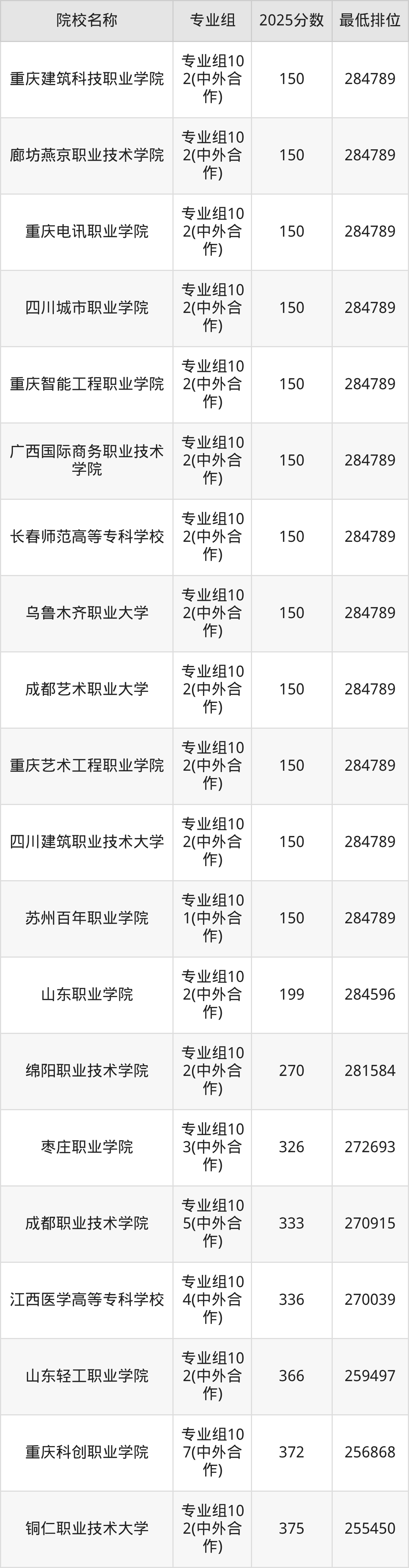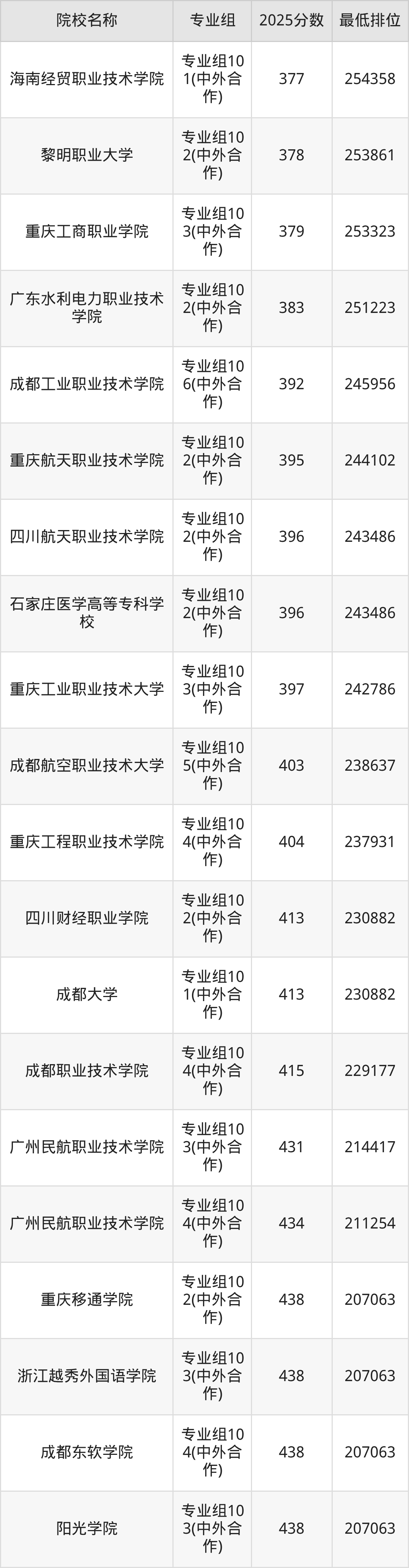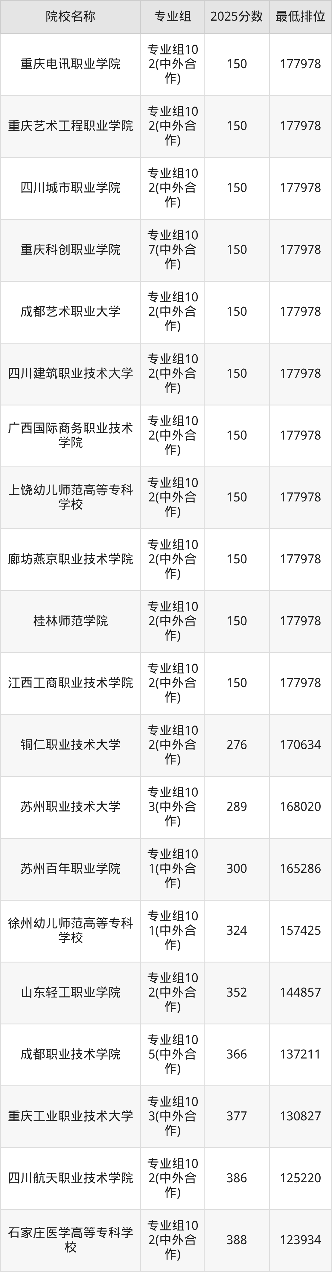 第三梯队(160分及以下):重庆电讯职业学院(专业组102(中外合作)是150分)、重庆艺术工程职业学院(专业组102(中外合作)是150分)、四川城市职业学院(专业组102(中外合作)是150分)、重庆科创职业学院(专业组107(中外合作)是150分)