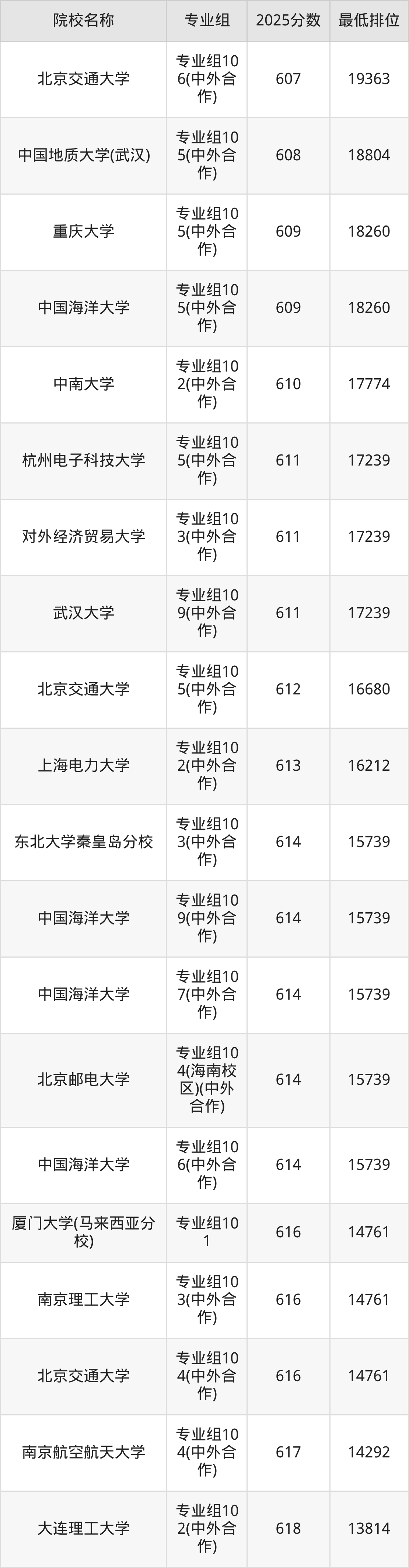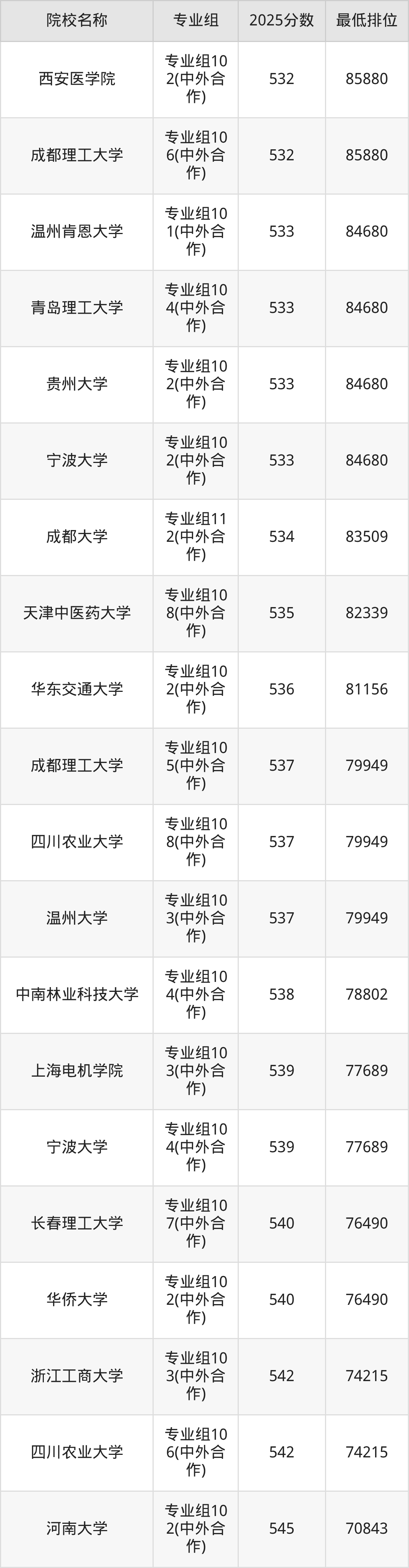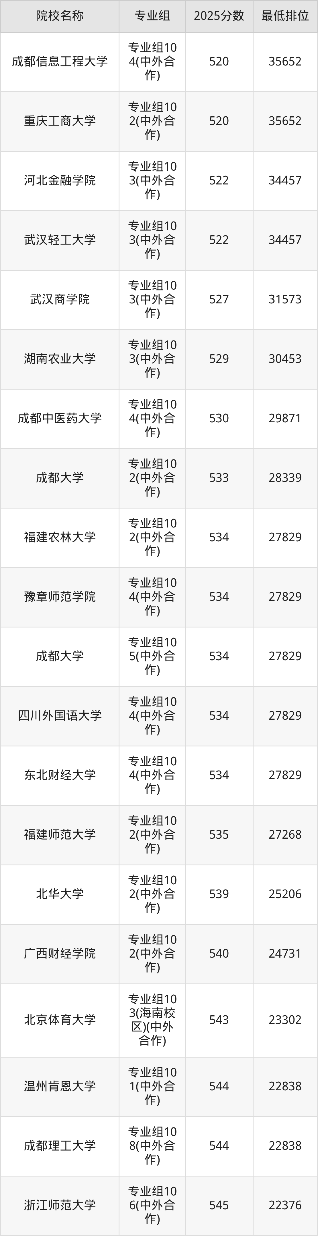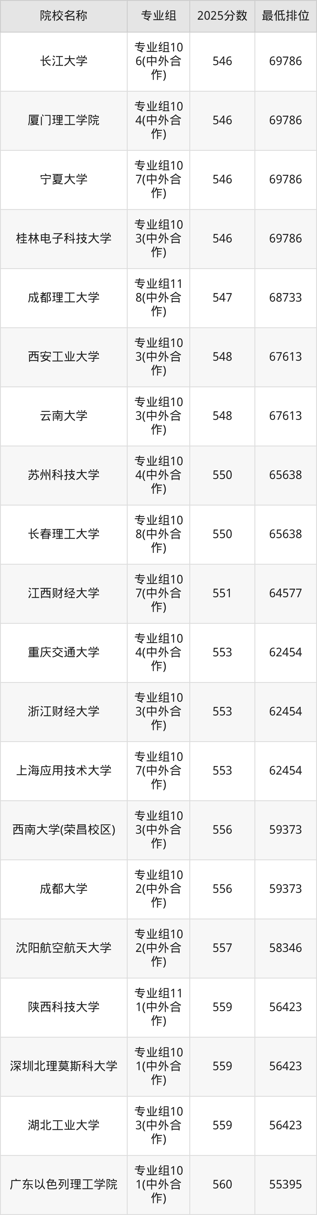 附中外合作办学院校2025年在四川高考物理类的录取分数线一览表: