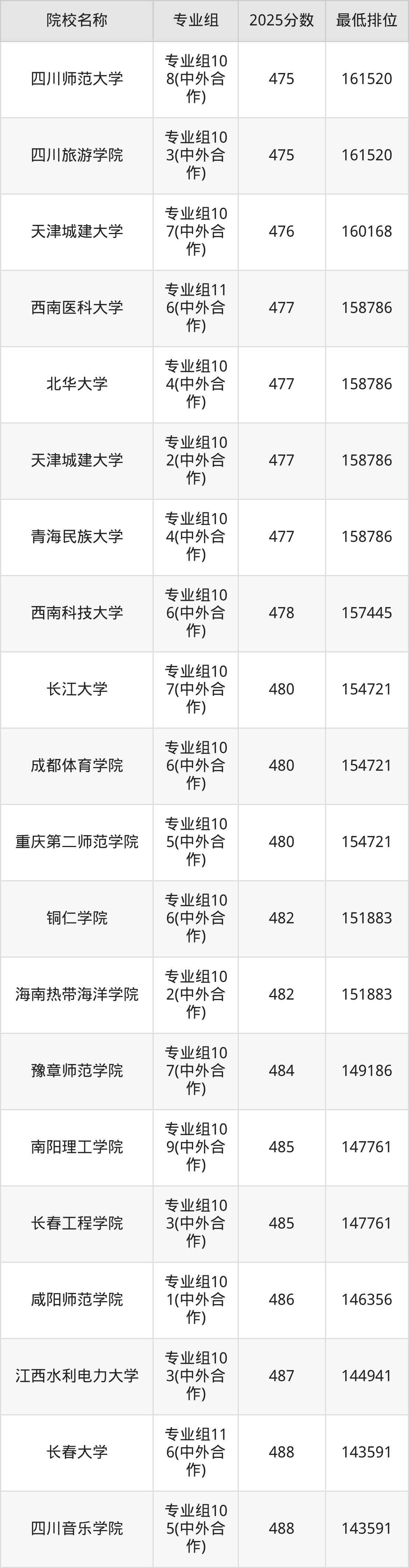 第三梯队(160分及以下):重庆建筑科技职业学院(专业组102(中外合作)是150分)、廊坊燕京职业技术学院(专业组102(中外合作)是150分)、重庆电讯职业学院(专业组102(中外合作)是150分)、四川城市职业学院(专业组102(中外合作)是150分)