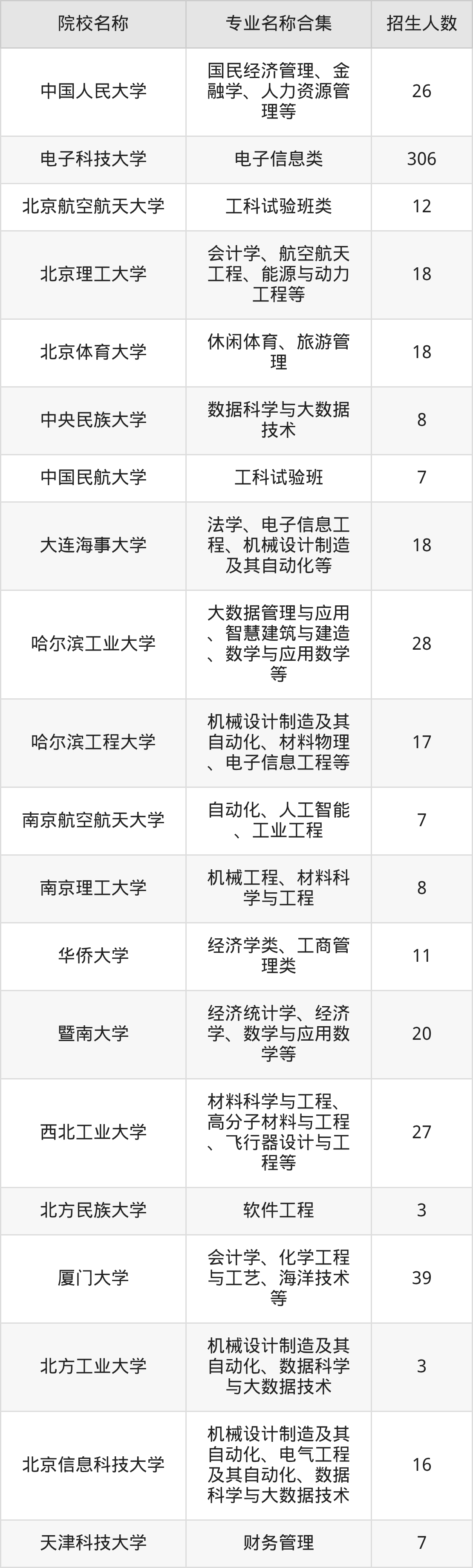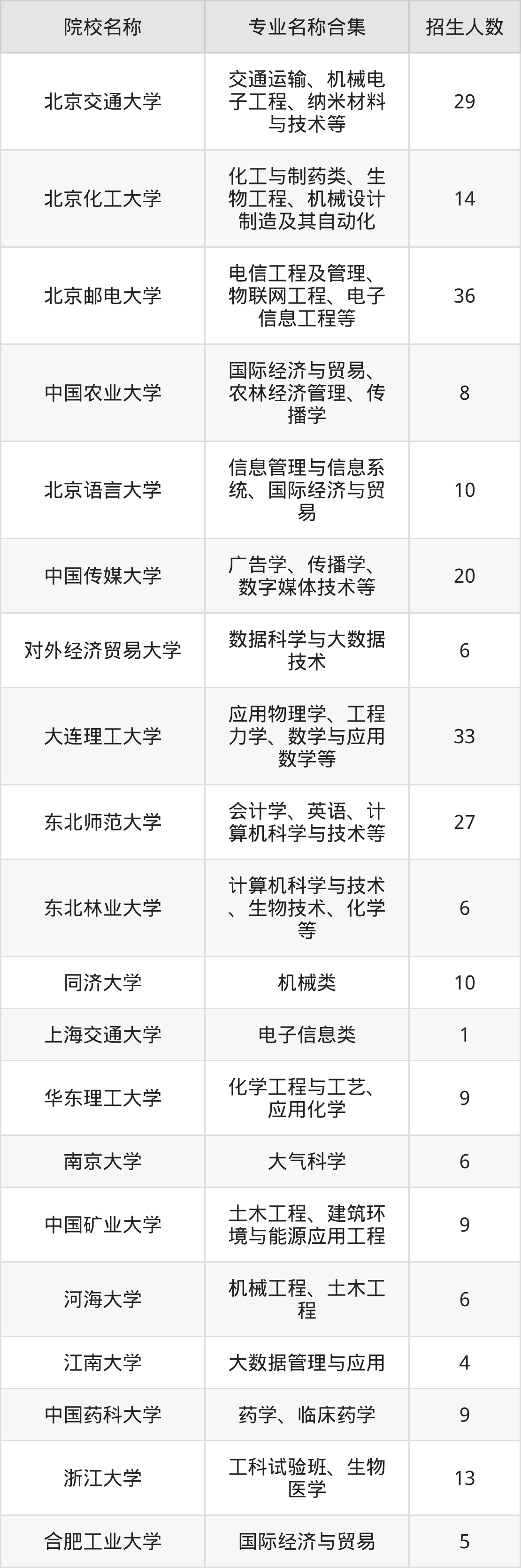 北京:北京交通大学、北京化工大学、北京邮电大学、中国农业大学、北京语言大学、中国传媒大学、对外经济贸易大学、中央美术学院、中国人民大学、北京航空航天大学、北京理工大学、北京体育大学、中央民族大学、北方工业大学、北京信息科技大学、北京外国语大学、北京第二外国语学院