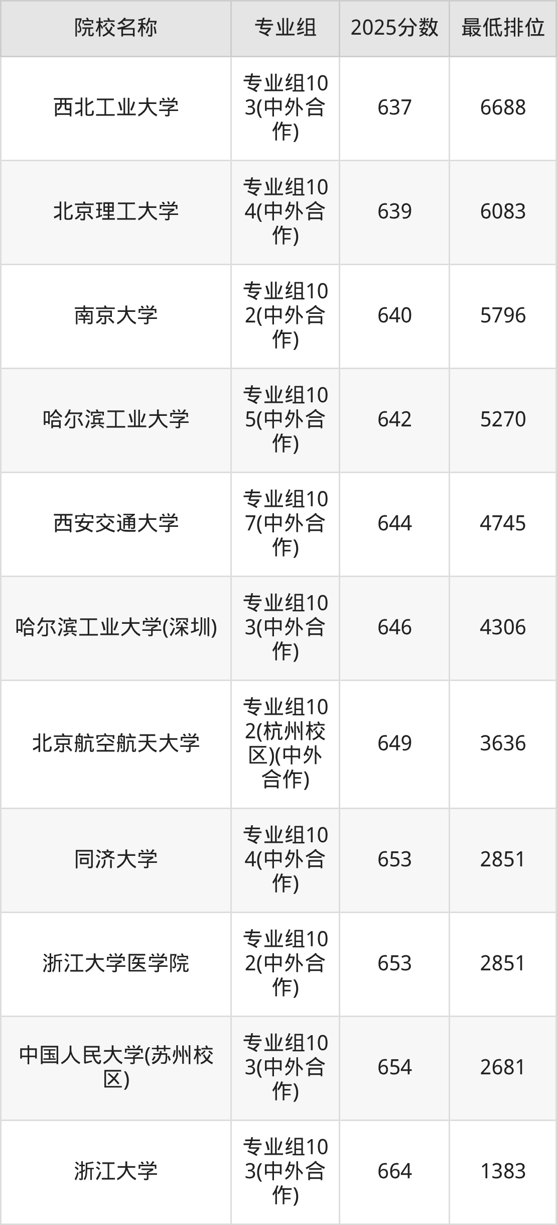 第一梯队(660分+):浙江大学(专业组103(中外合作)是664分)