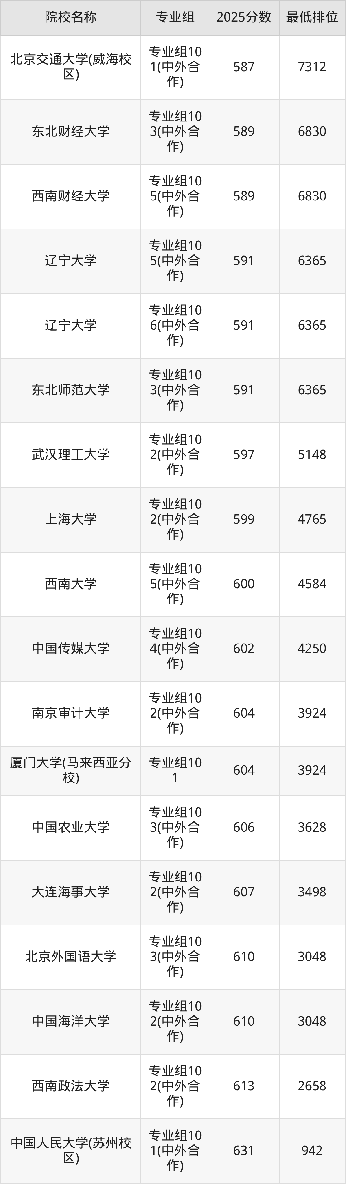 2025年在四川高考共计271所中外合作办学院校招生,省外高校有246所、省内高校有25所,包含四川大学、西南交通大学、西南财经大学等。再看四川中外合作办学大学2025年录取分数线,物理类最低分区间是150至664分,历史类最低分区间是150至631分,2026届有意报考的同学请参考!