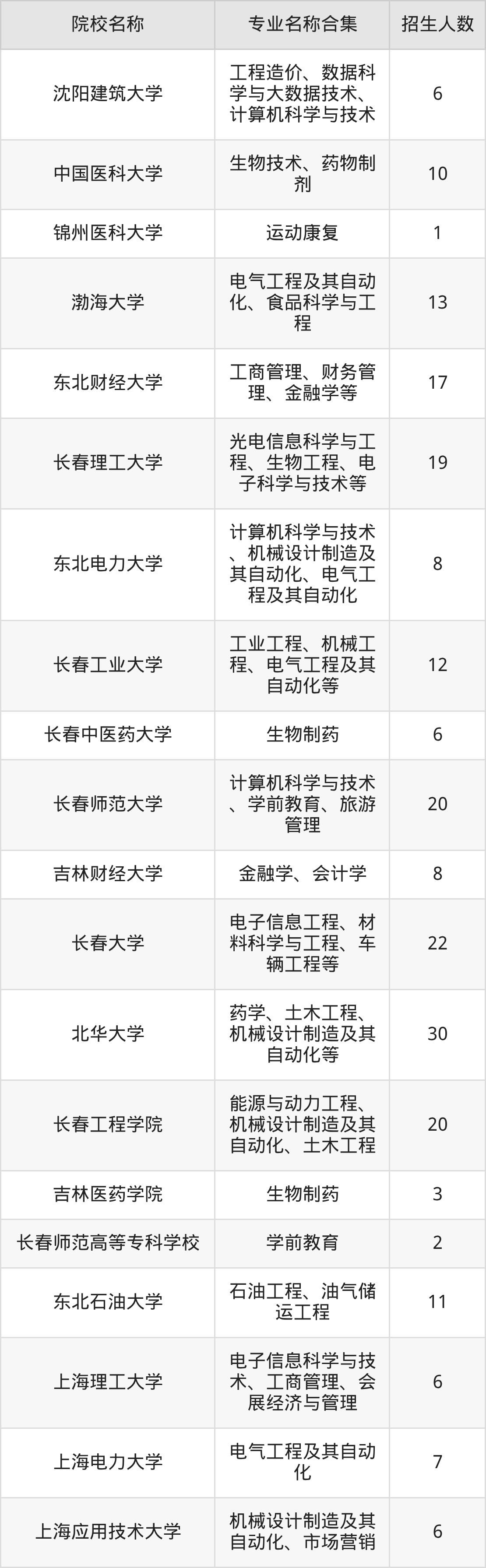 吉林:东北师范大学、长春理工大学、东北电力大学、长春工业大学、长春中医药大学、长春师范大学、吉林财经大学、长春大学、北华大学、长春工程学院、吉林医药学院、长春师范高等专科学校