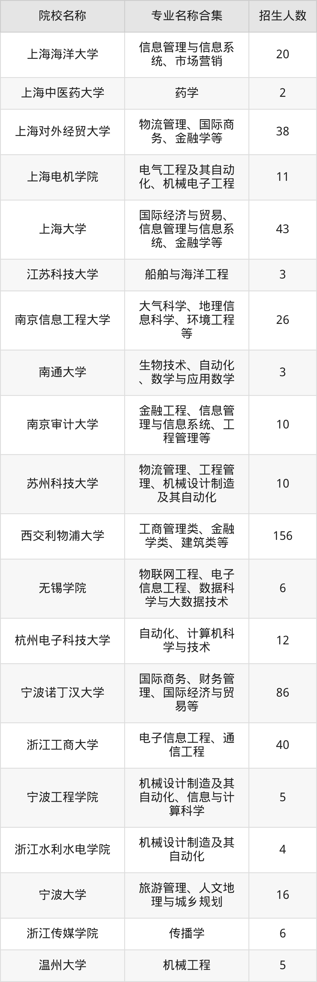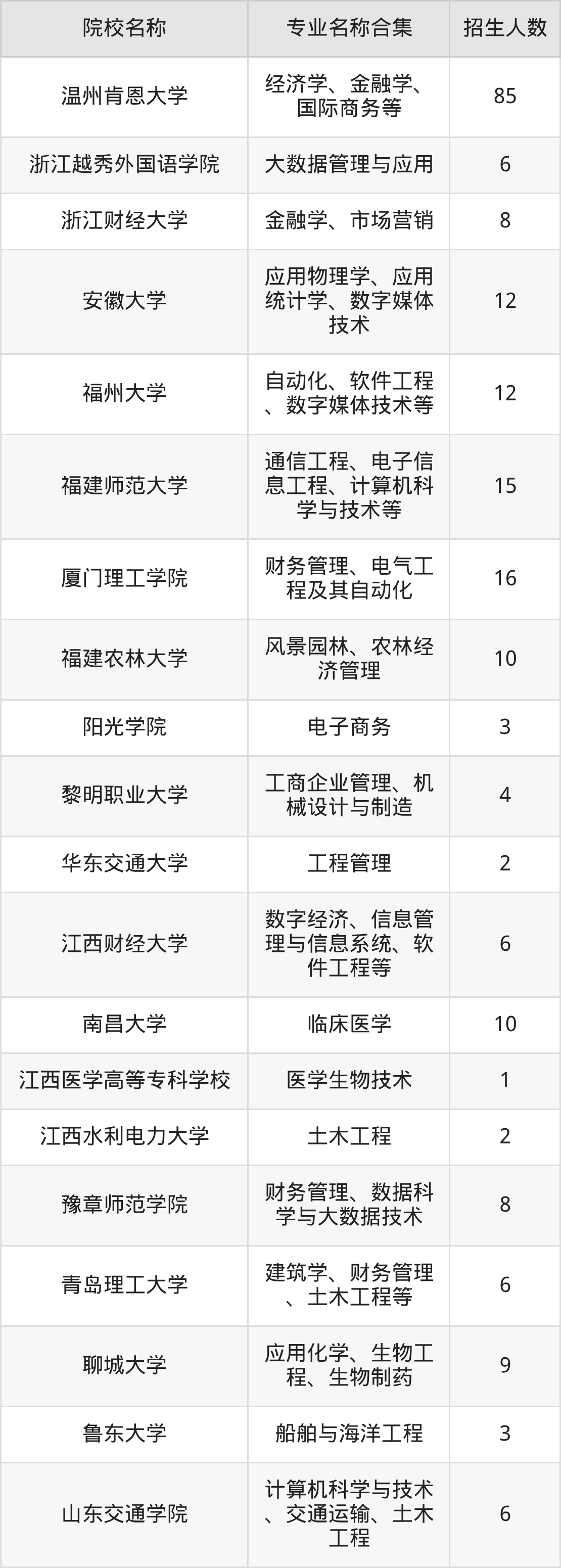 浙江:浙江大学、杭州电子科技大学、宁波诺丁汉大学、浙江工商大学、宁波工程学院、浙江水利水电学院、宁波大学、浙江传媒学院、温州大学、温州肯恩大学、浙江越秀外国语学院、浙江财经大学、浙江师范大学、浙江外国语学院