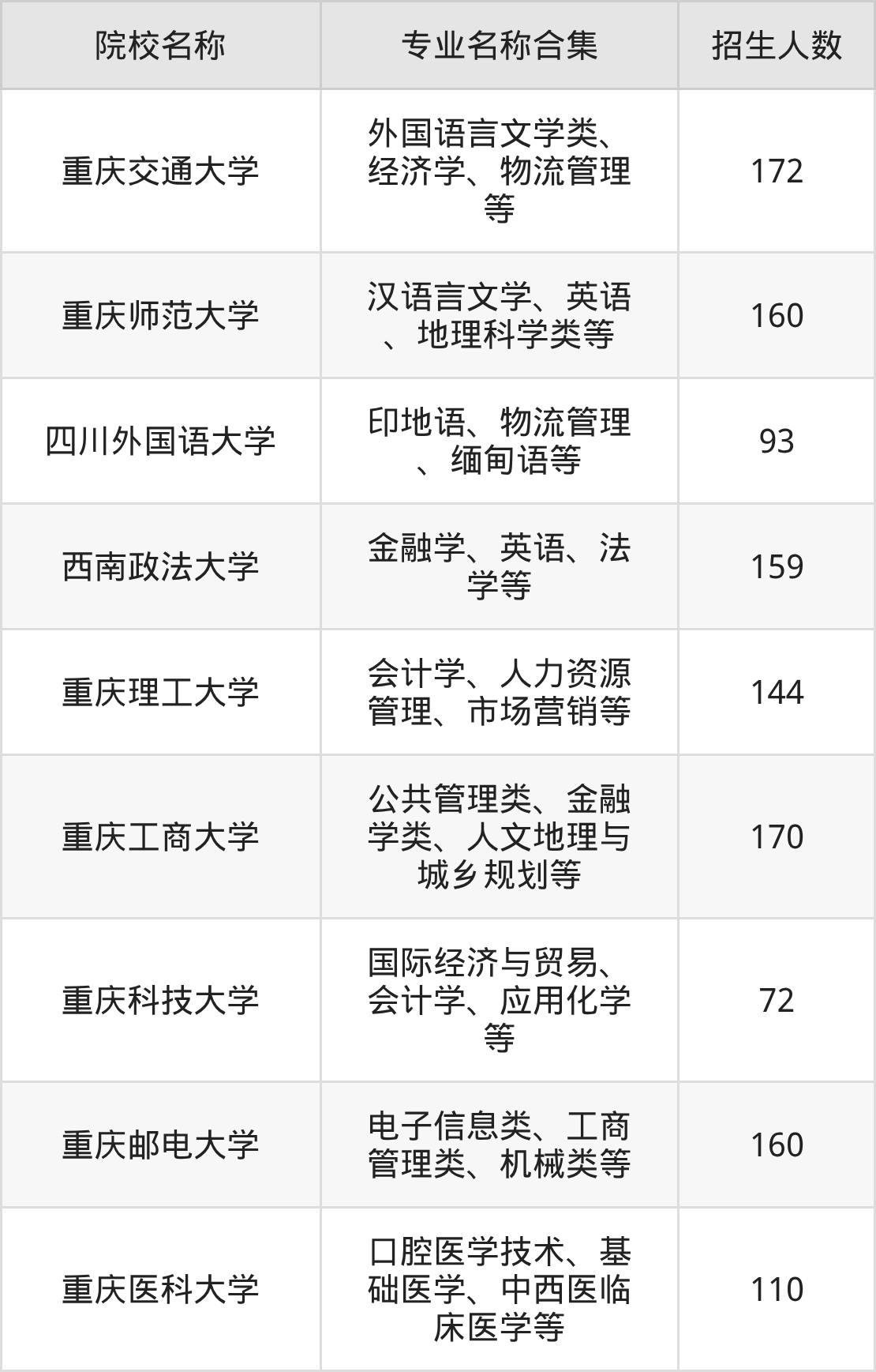 重庆:重庆交通大学、重庆师范大学、四川外国语大学、西南政法大学、重庆理工大学、重庆工商大学、重庆科技大学、重庆邮电大学、重庆医科大学