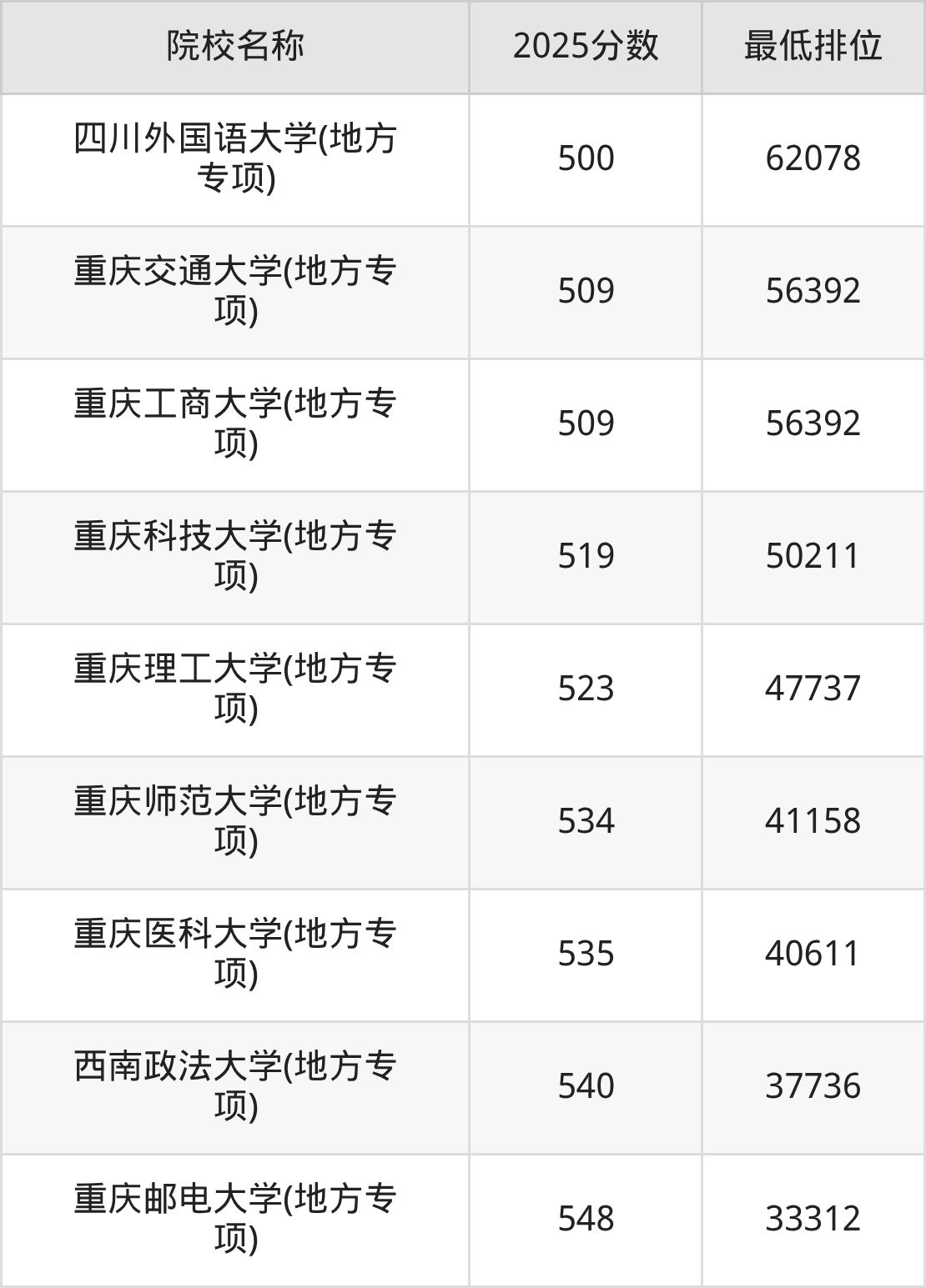 第三梯队(510分及以下):四川外国语大学(地方专项)(500分)、重庆交通大学(地方专项)(509分)、重庆工商大学(地方专项)(509分)