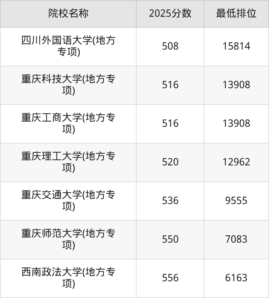 第一梯队(550分+):重庆师范大学(地方专项)(550分)、西南政法大学(地方专项)(556分)
