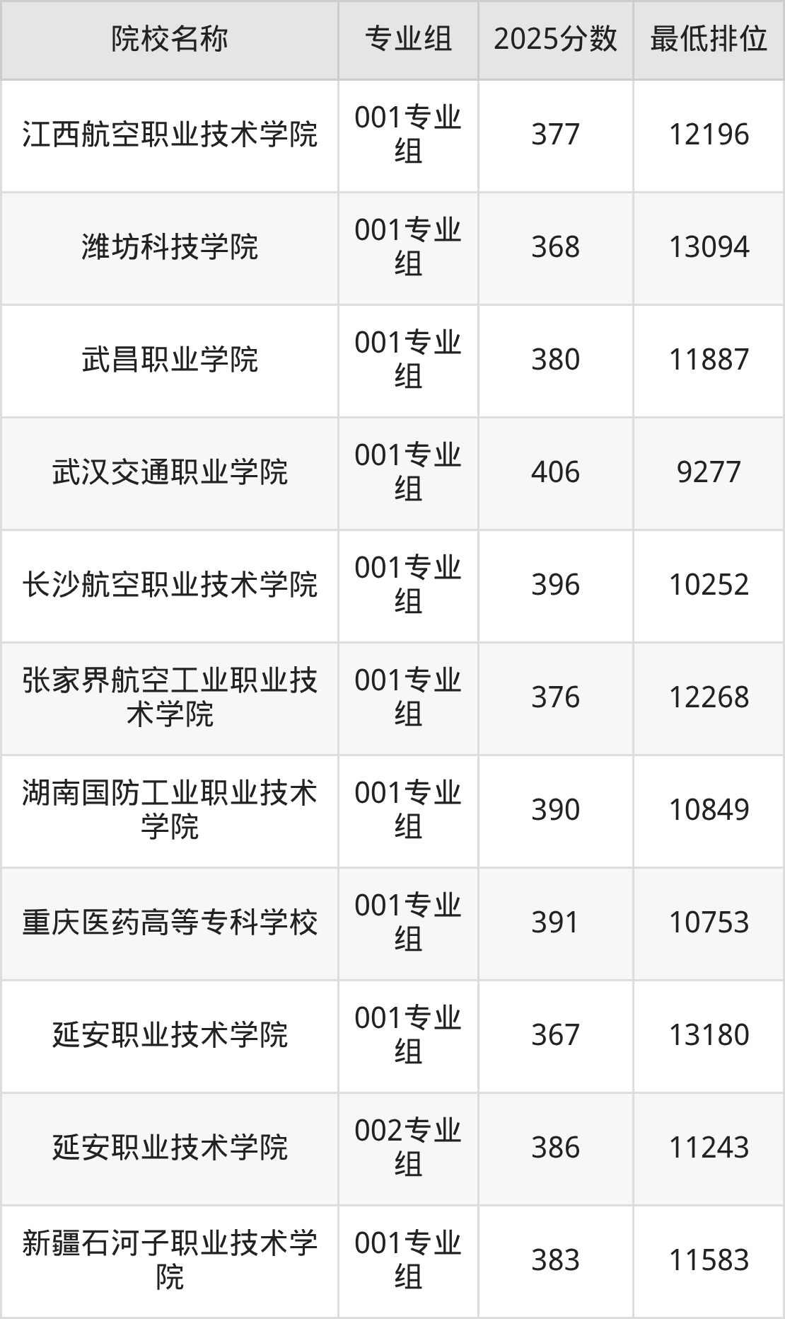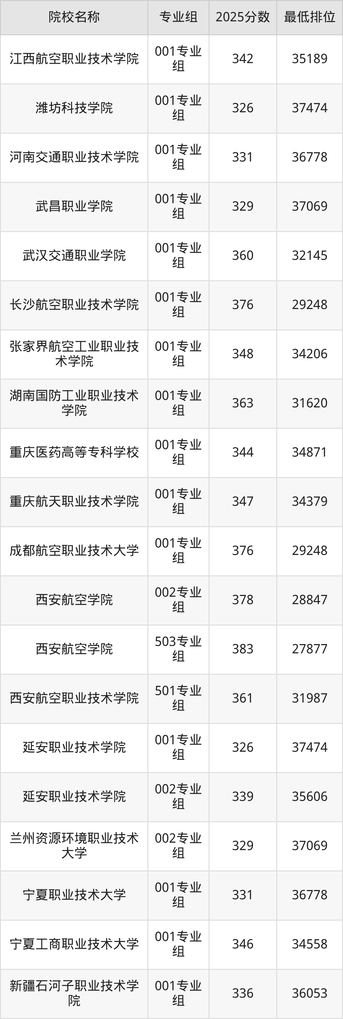 第二梯队(331-379分):江西航空职业技术学院(001专业组是342分)、河南交通职业技术学院(001专业组是331分)、武汉交通职业学院(001专业组是360分)、长沙航空职业技术学院(001专业组是376分)