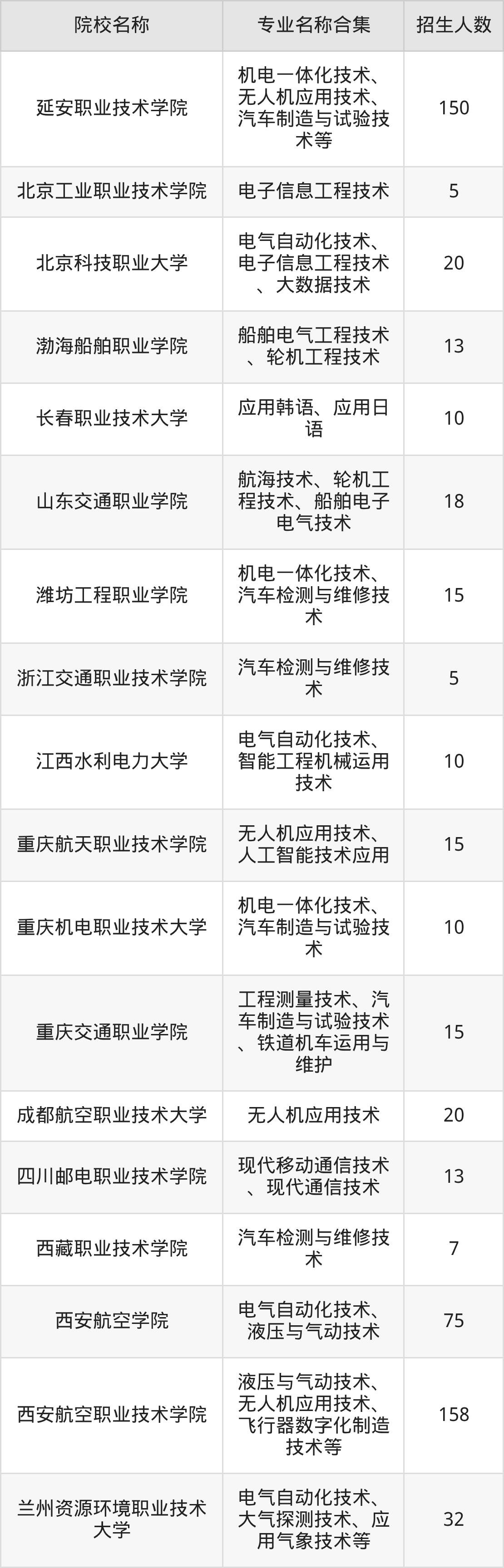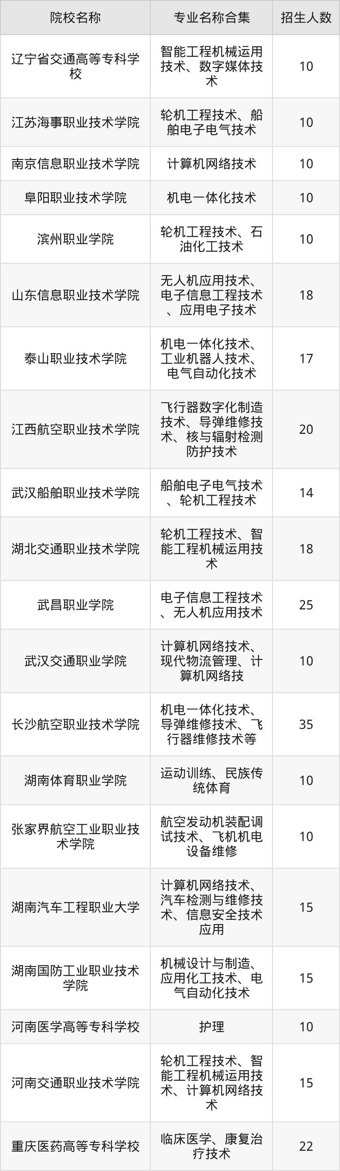 湖南:长沙航空职业技术学院、湖南体育职业学院、张家界航空工业职业技术学院、湖南汽车工程职业大学、湖南国防工业职业技术学院