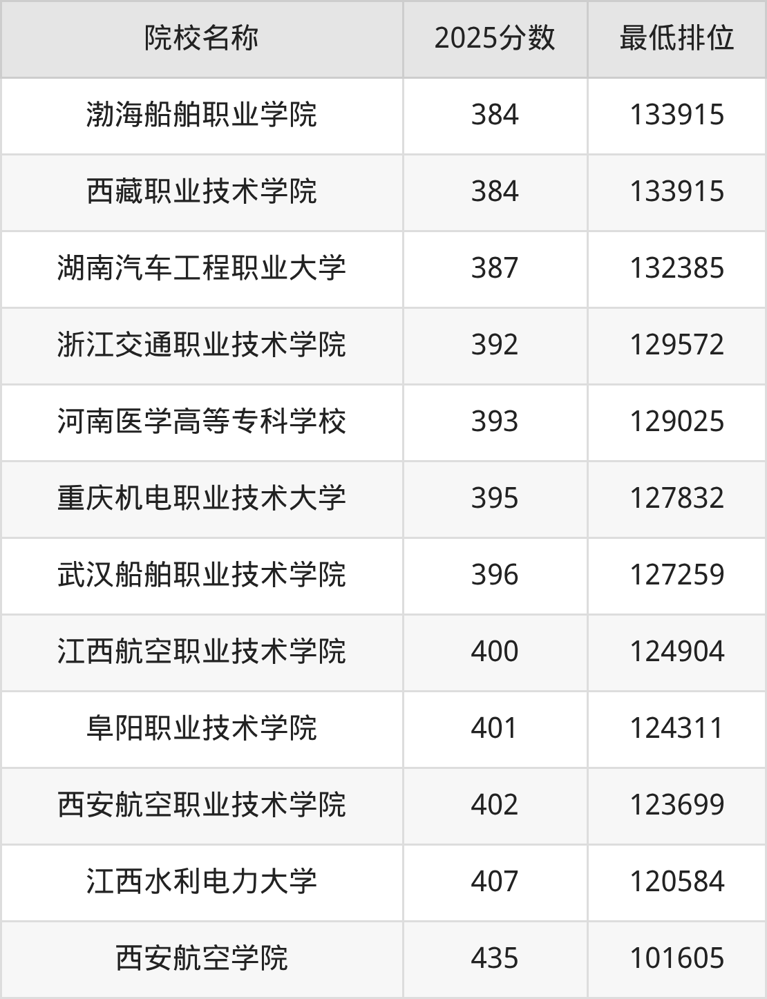 第三梯队(390分及以下):渤海船舶职业学院(384分)、西藏职业技术学院(384分)、湖南汽车工程职业大学(387分)