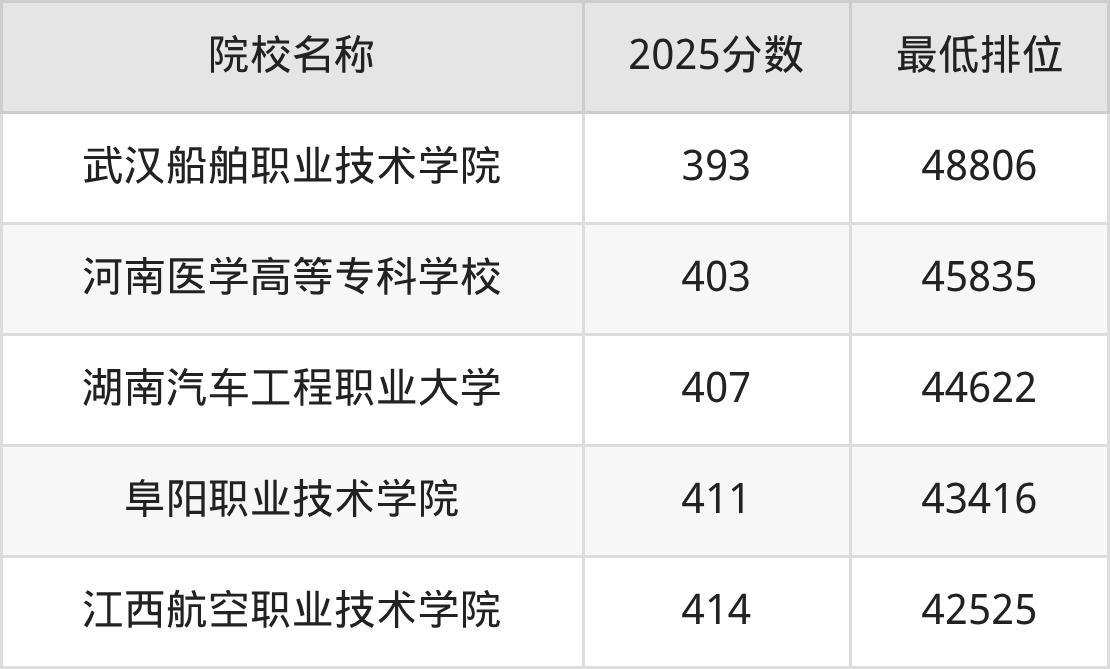 第二梯队(401-409分):河南医学高等专科学校(403分)、湖南汽车工程职业大学(407分)