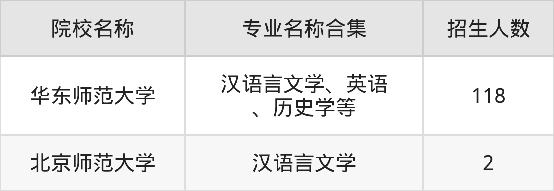 其中,华东师范大学以118人招生规模居首,北京师范大学2人紧随其后,构成招生第一梯队。