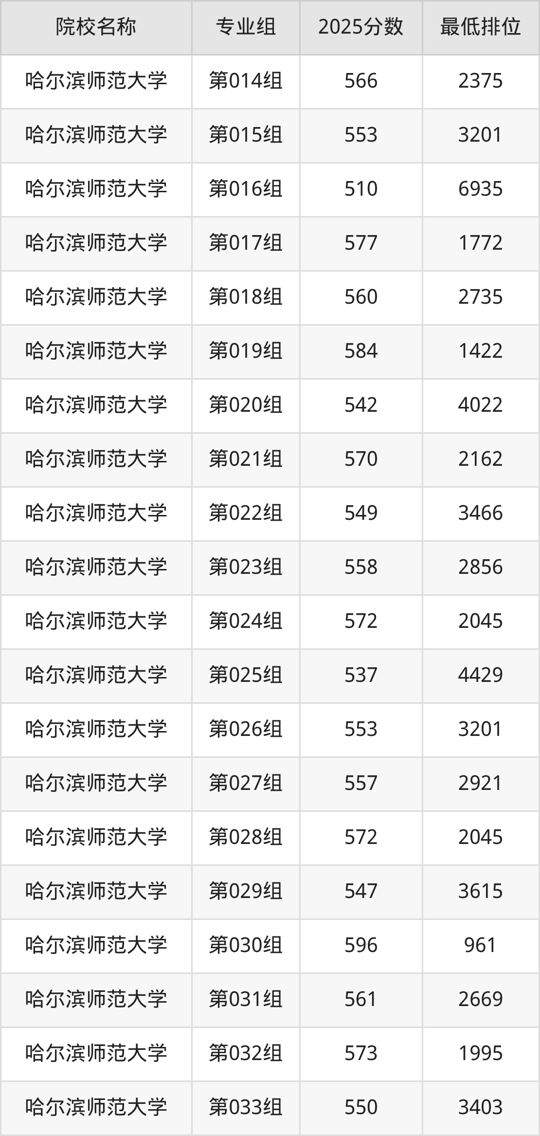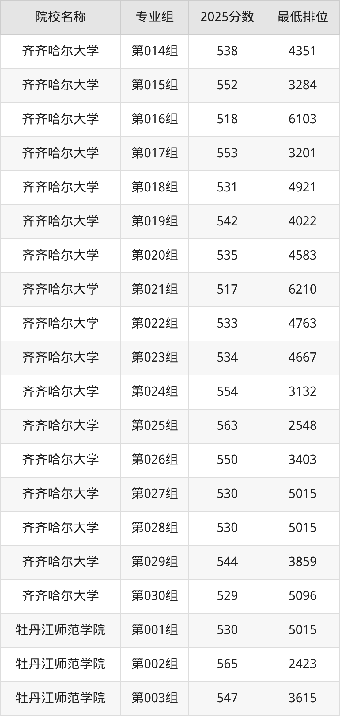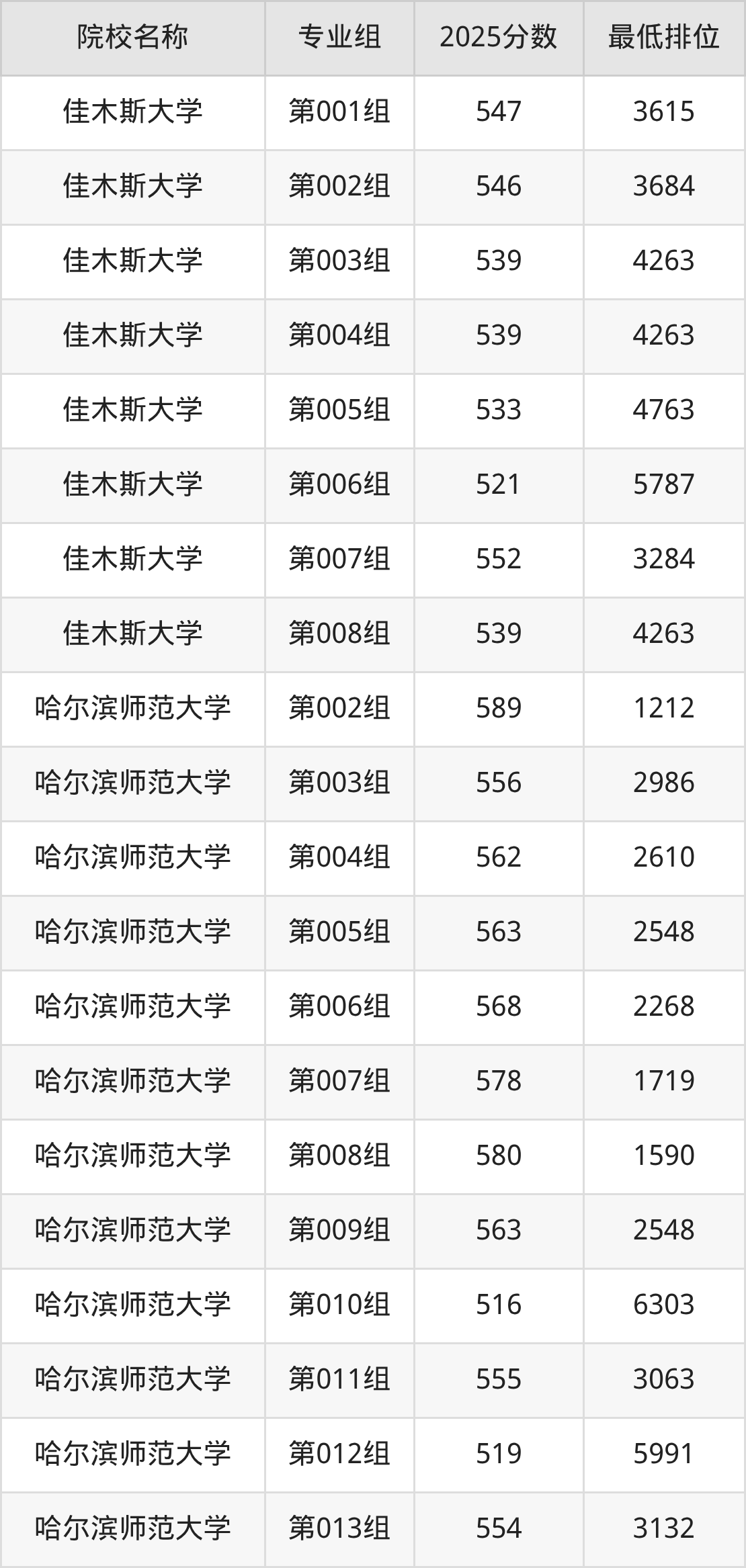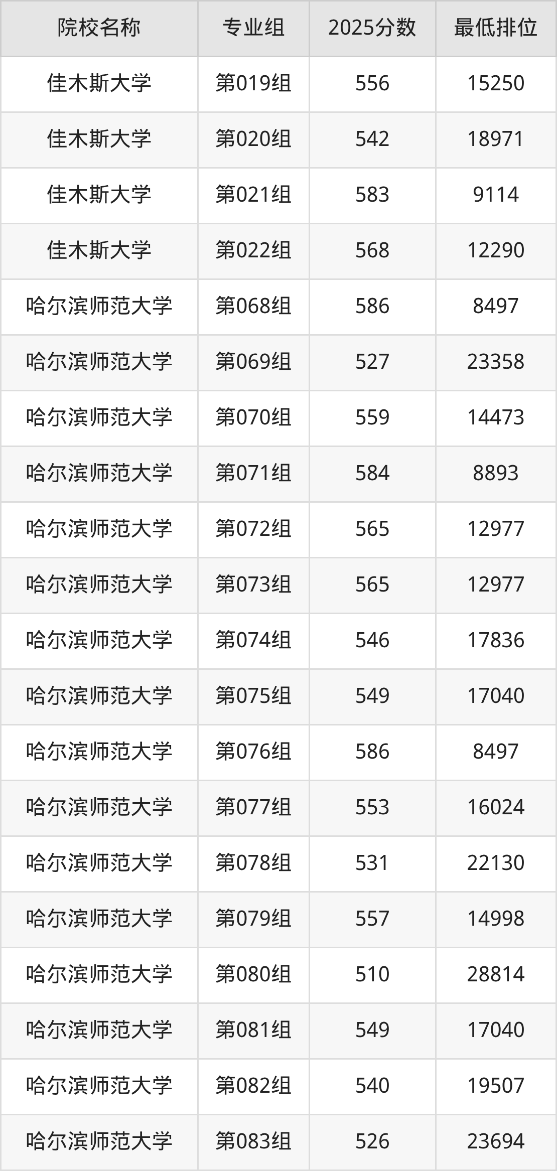 第二梯队(491-579分):佳木斯大学(第019组是556分)、佳木斯大学(第020组是542分)、佳木斯大学(第022组是568分)、哈尔滨师范大学(第069组是527分)