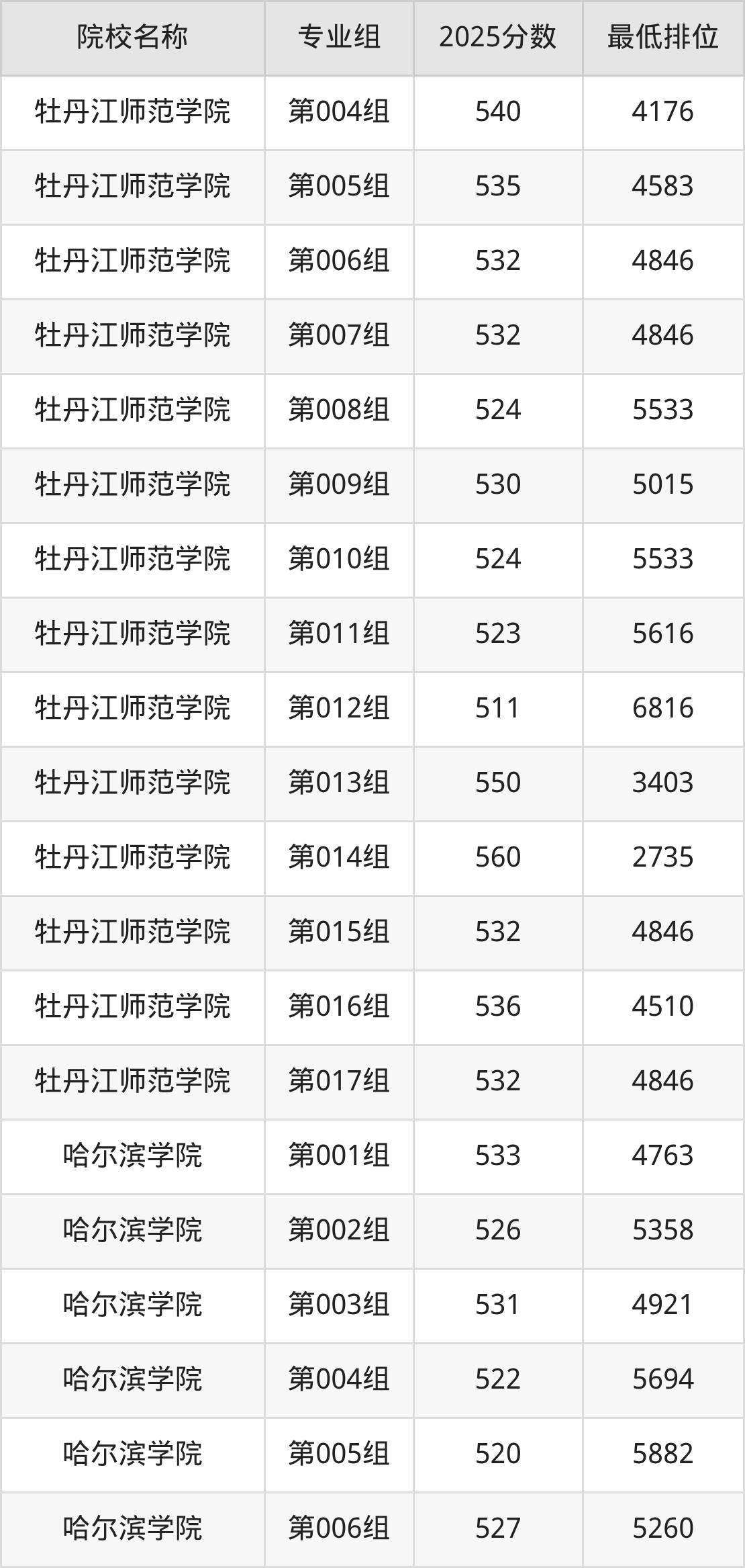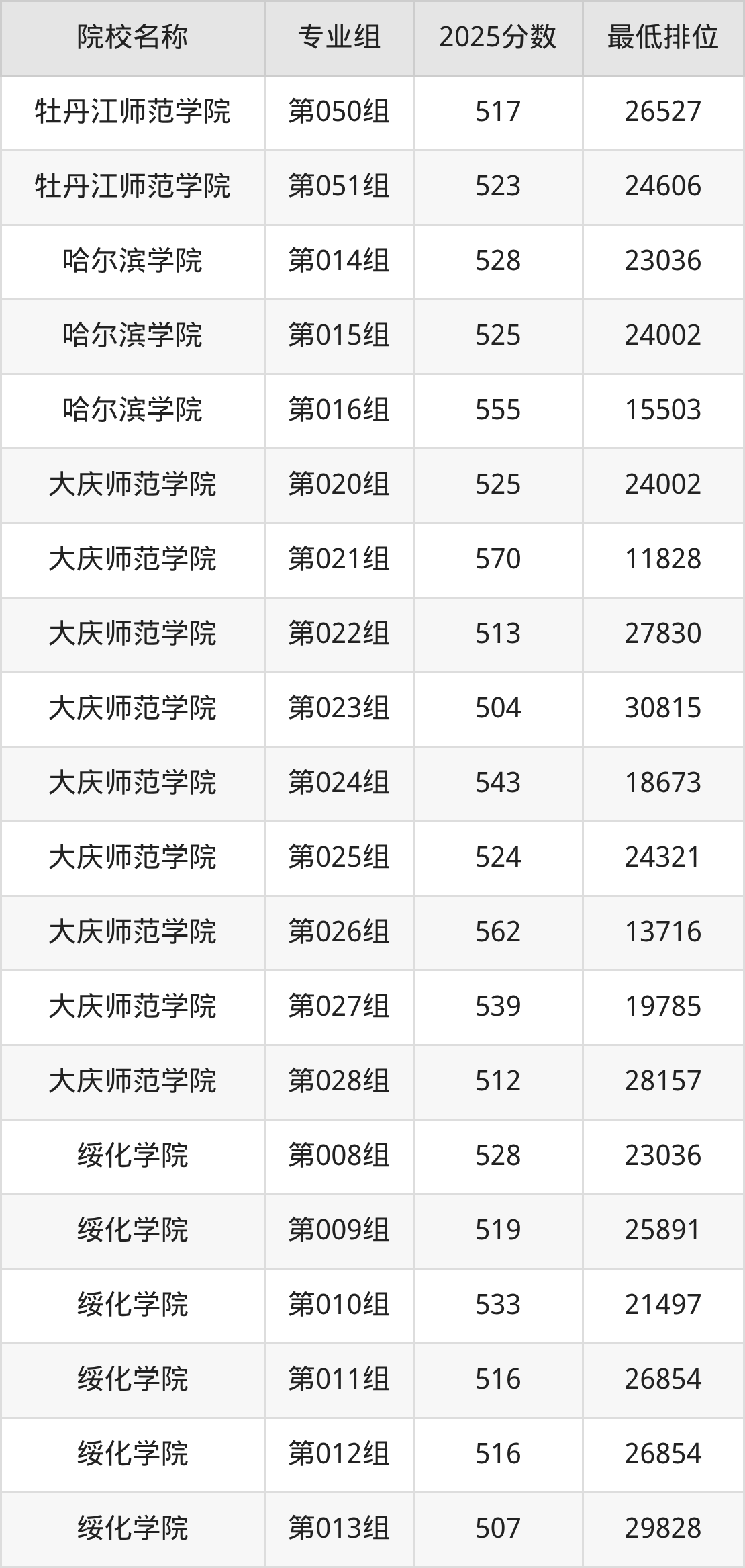 第三梯队(510分及以下):哈尔滨师范大学(第016组是510分)、大庆师范学院(第003组是509分)、绥化学院(第002组是509分)、绥化学院(第003组是505分)
