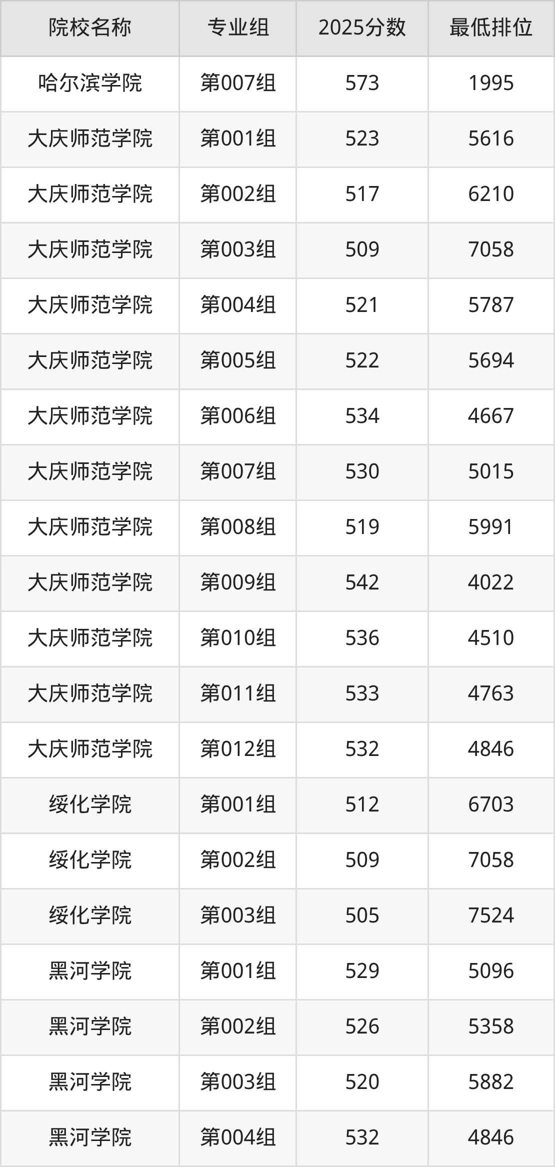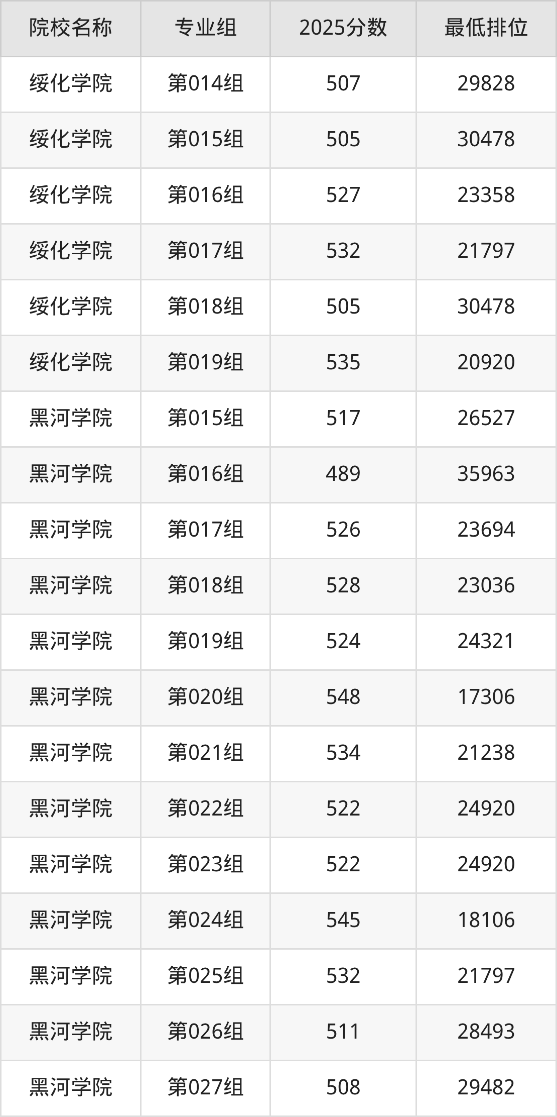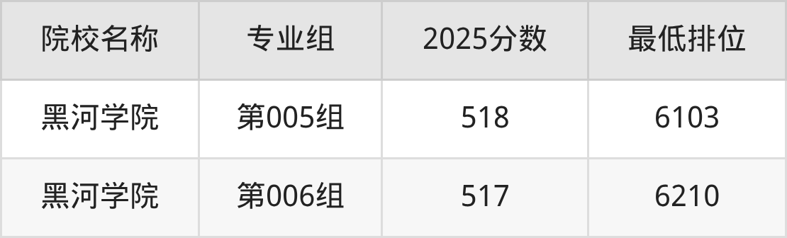 第三梯队(490分及以下):黑河学院(第016组是489分)