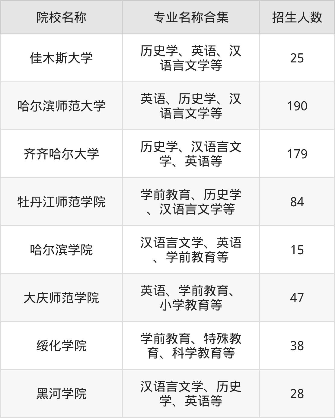 其中,哈尔滨师范大学以190人招生规模居首,齐齐哈尔大学179人紧随其后,牡丹江师范学院招84人,构成招生第一梯队。