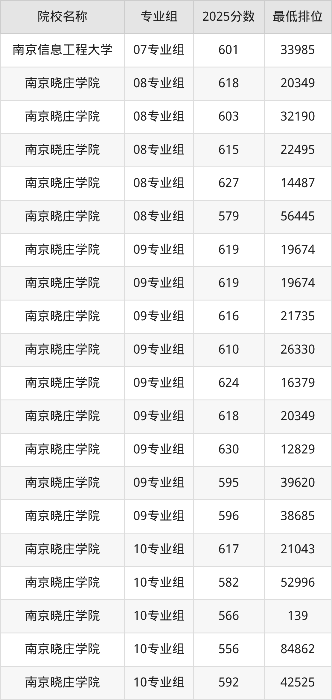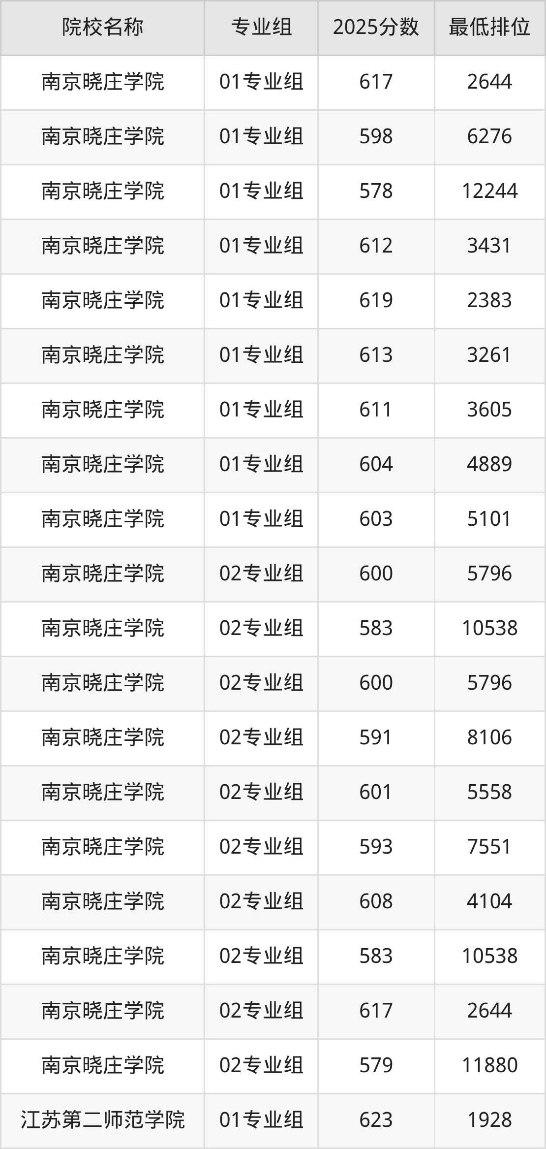 第二梯队(571-629分):南京晓庄学院(01专业组是617分)、南京晓庄学院(01专业组是598分)、南京晓庄学院(01专业组是578分)、南京晓庄学院(01专业组是612分)