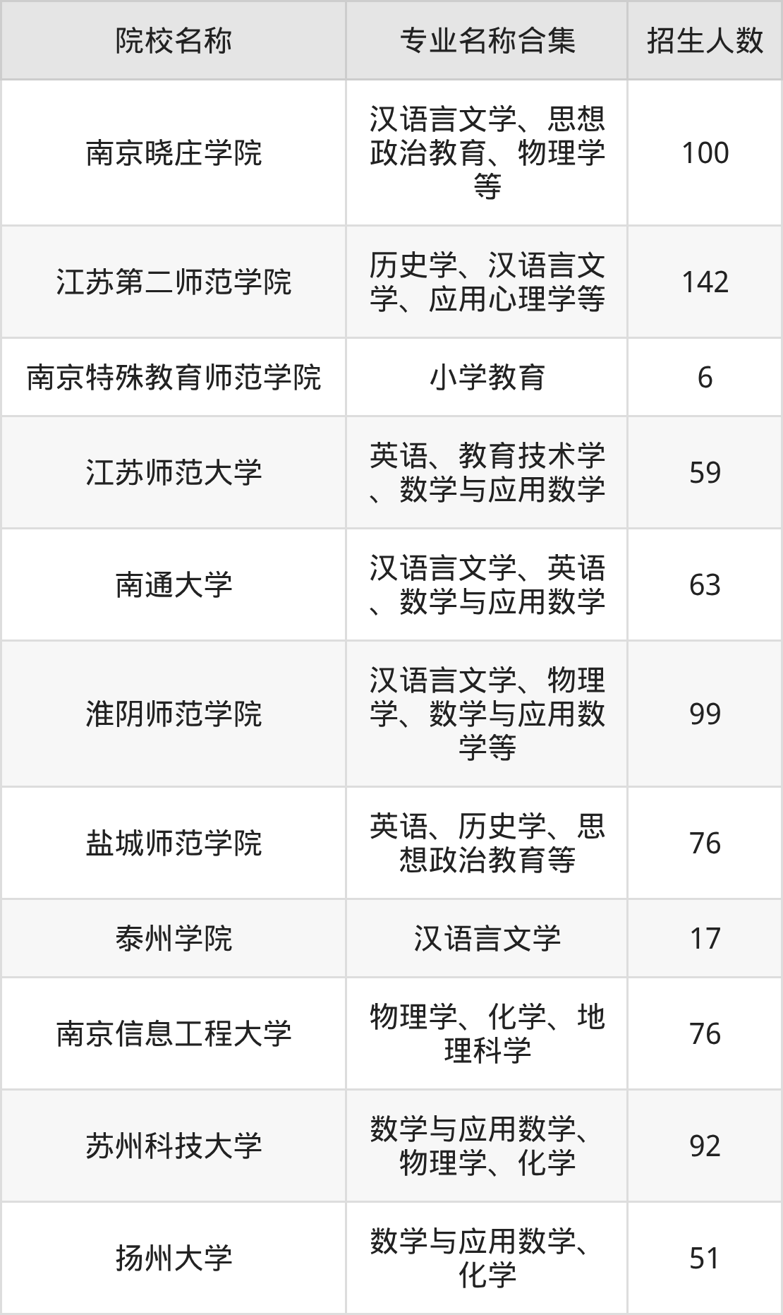 江苏:南京晓庄学院、江苏第二师范学院、南京特殊教育师范学院、江苏师范大学、南通大学、淮阴师范学院、盐城师范学院、泰州学院、南京信息工程大学、苏州科技大学、扬州大学