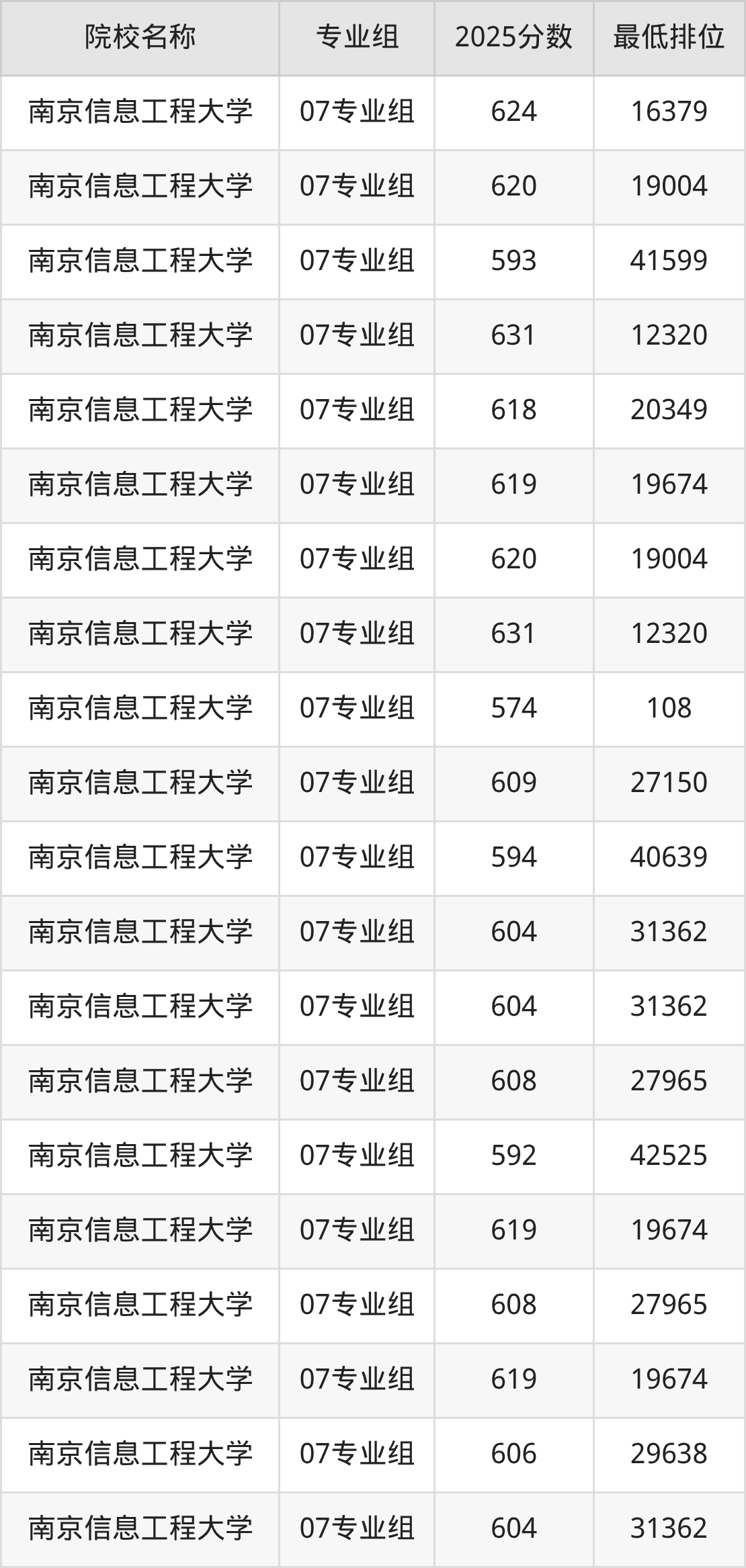 第二梯队(551-629分):南京信息工程大学(07专业组是624分)、南京信息工程大学(07专业组是620分)、南京信息工程大学(07专业组是593分)、南京信息工程大学(07专业组是618分)