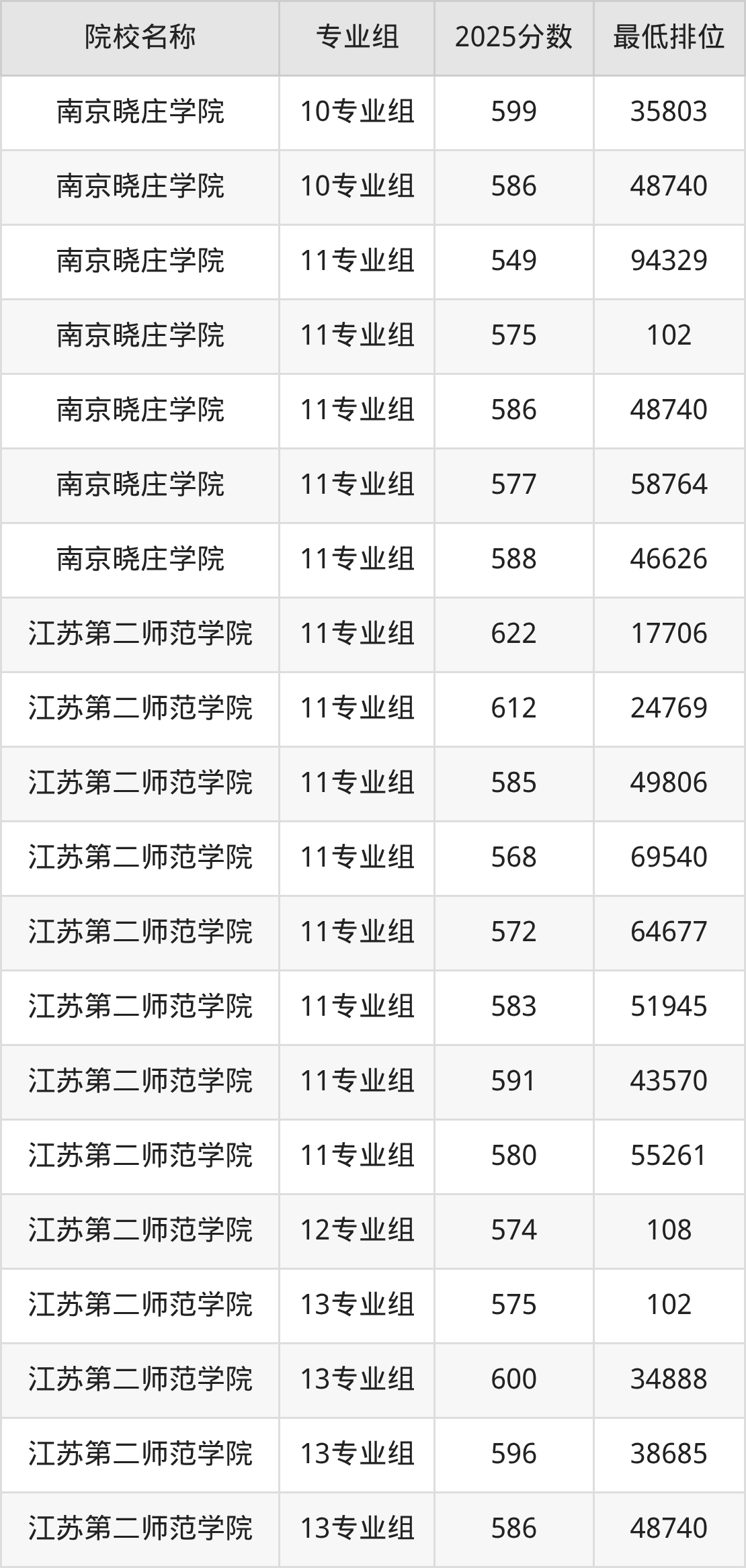 第三梯队(550分及以下):南京晓庄学院(11专业组是549分)