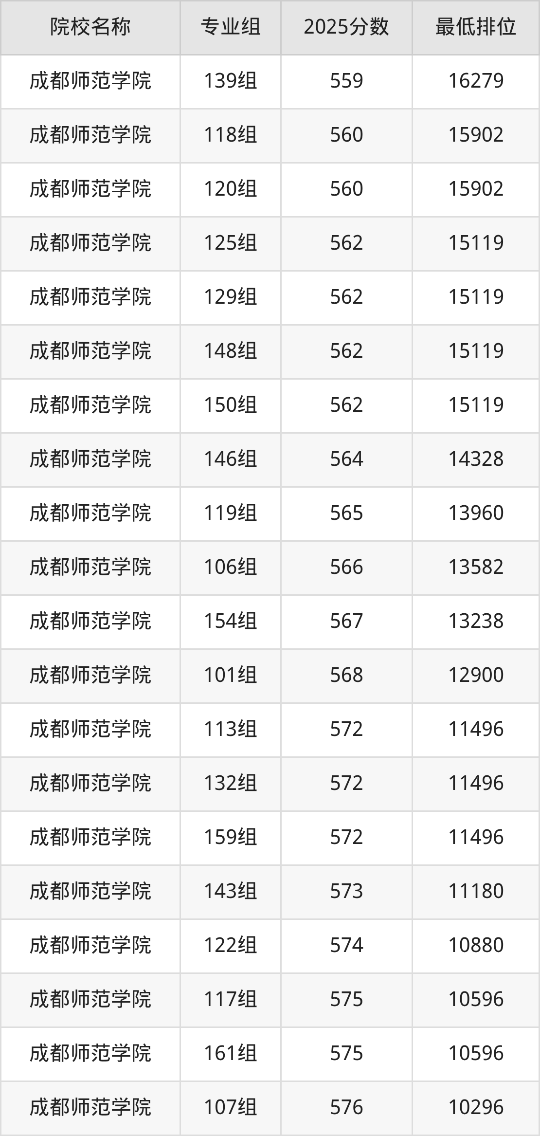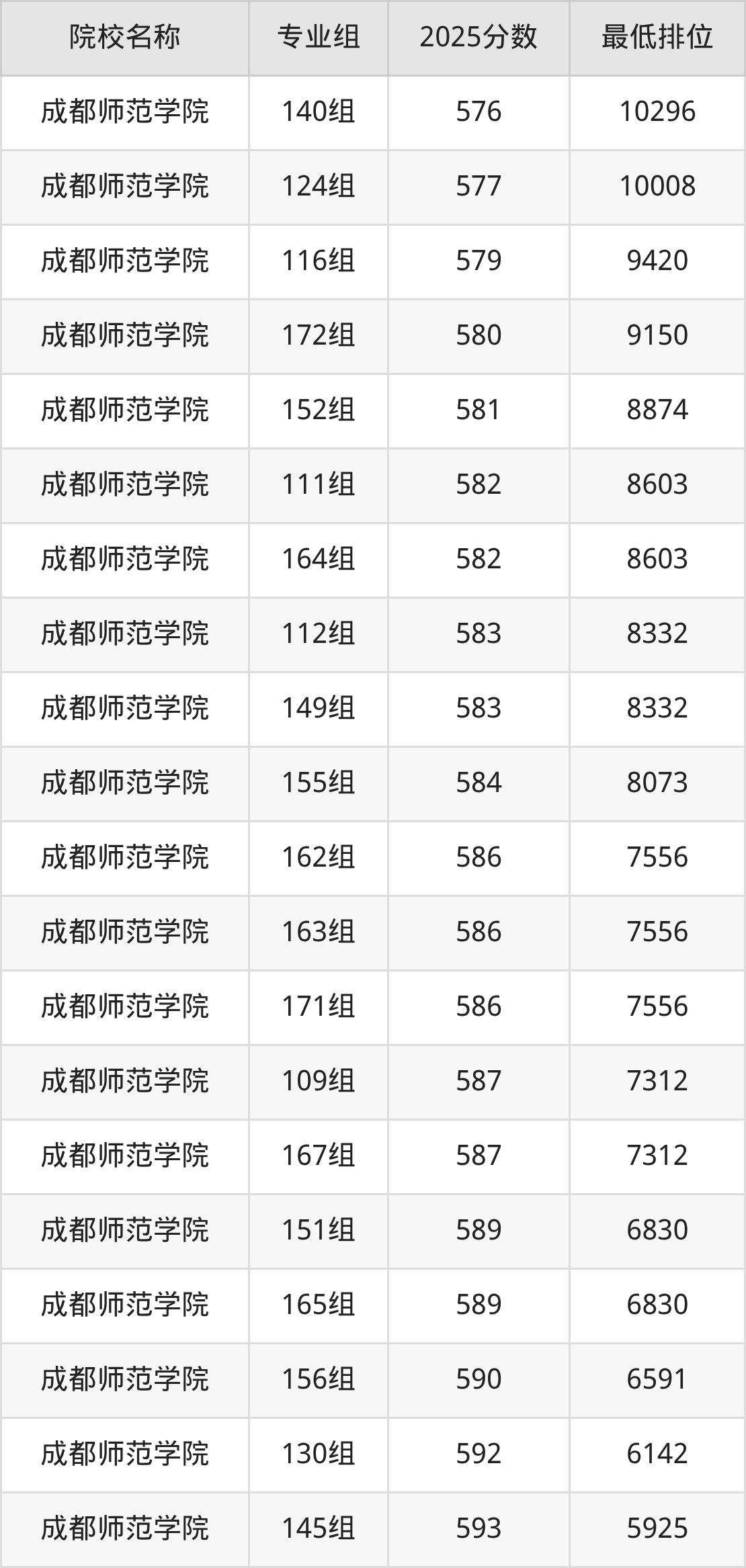 第二梯队(481-589分):成都师范学院(113组是495分)、四川师范大学(498分)、西华师范大学(502分)、成都师范学院(168组是503分)