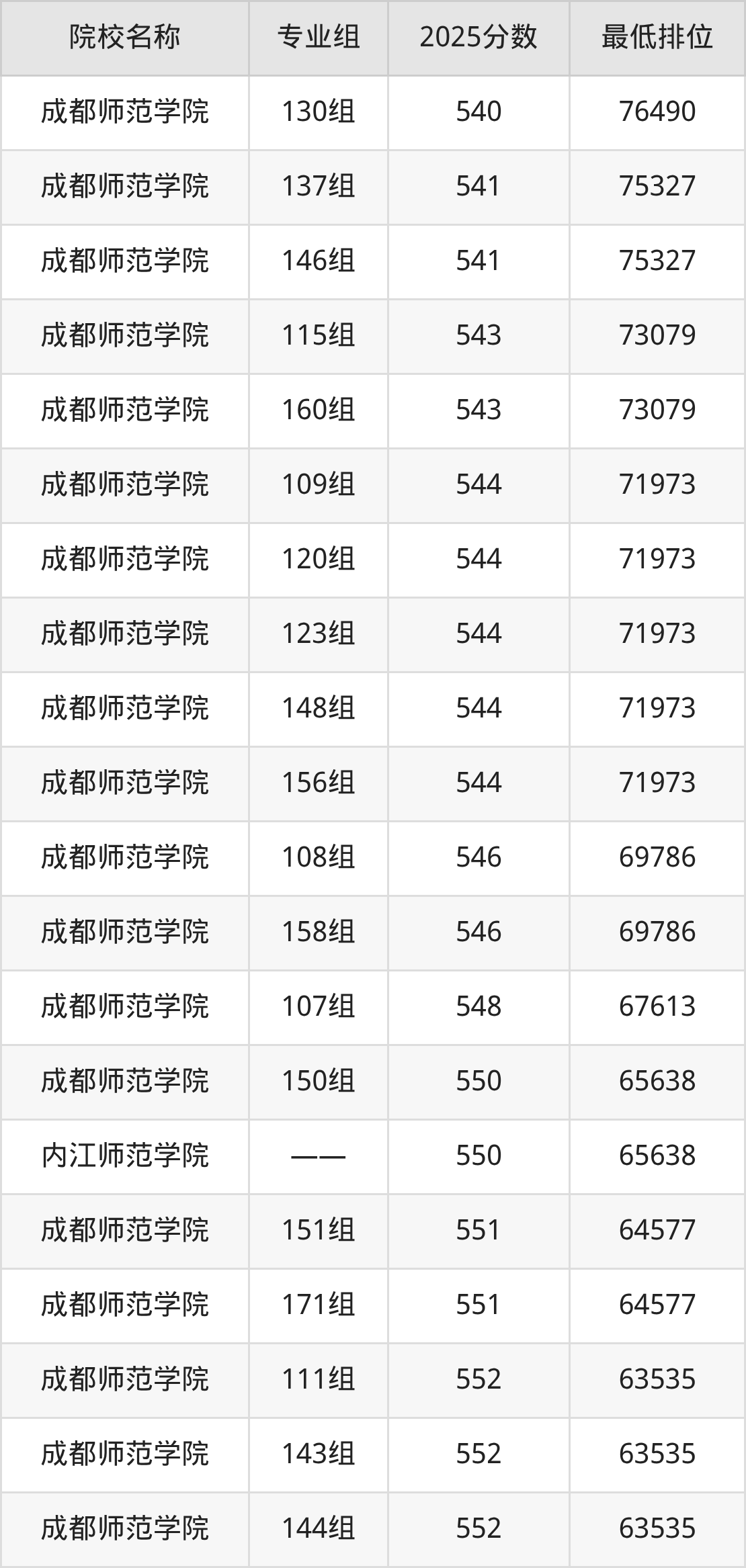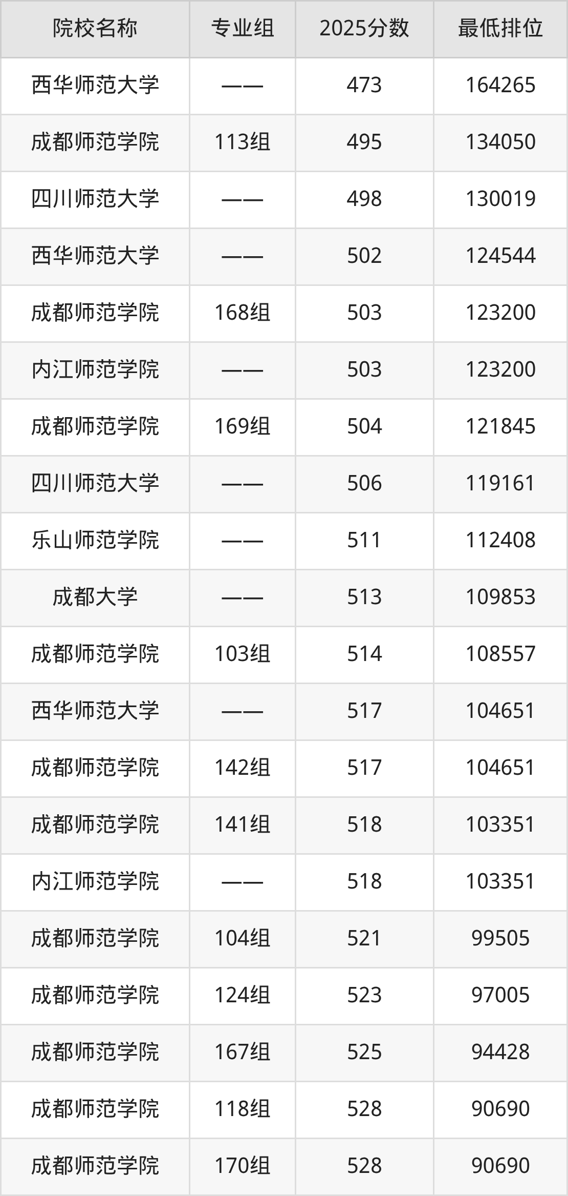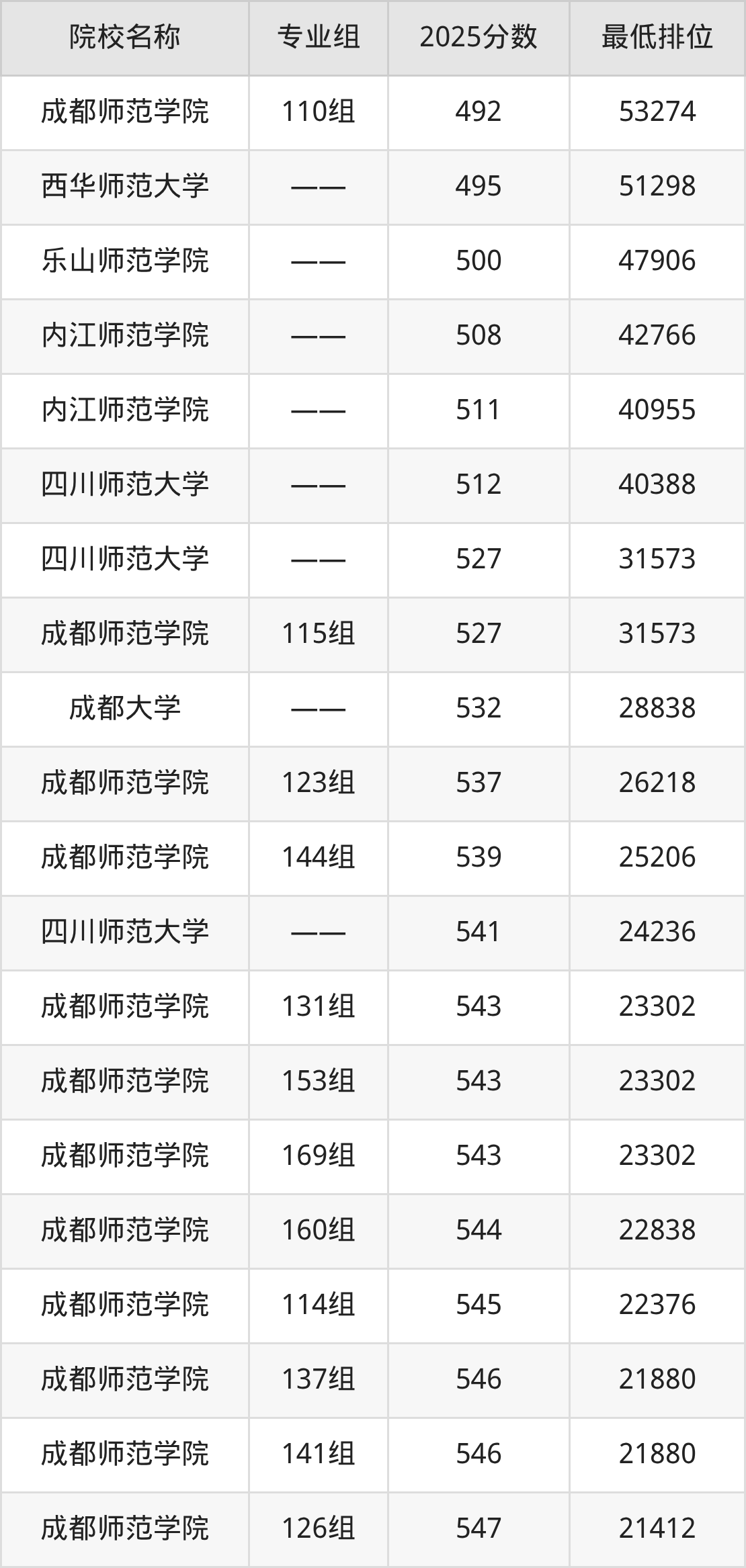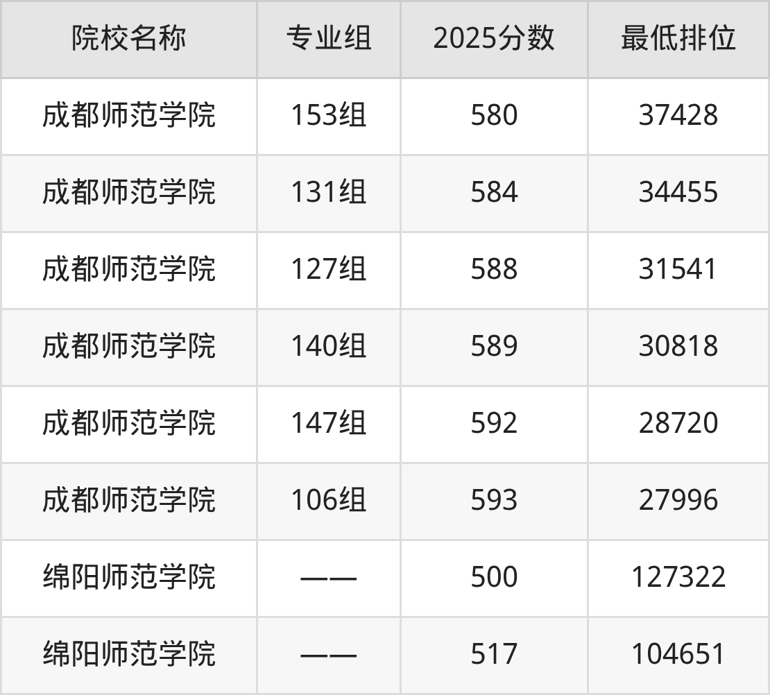 第三梯队(500分及以下):成都师范学院(110组是492分)、西华师范大学(495分)、乐山师范学院(500分)