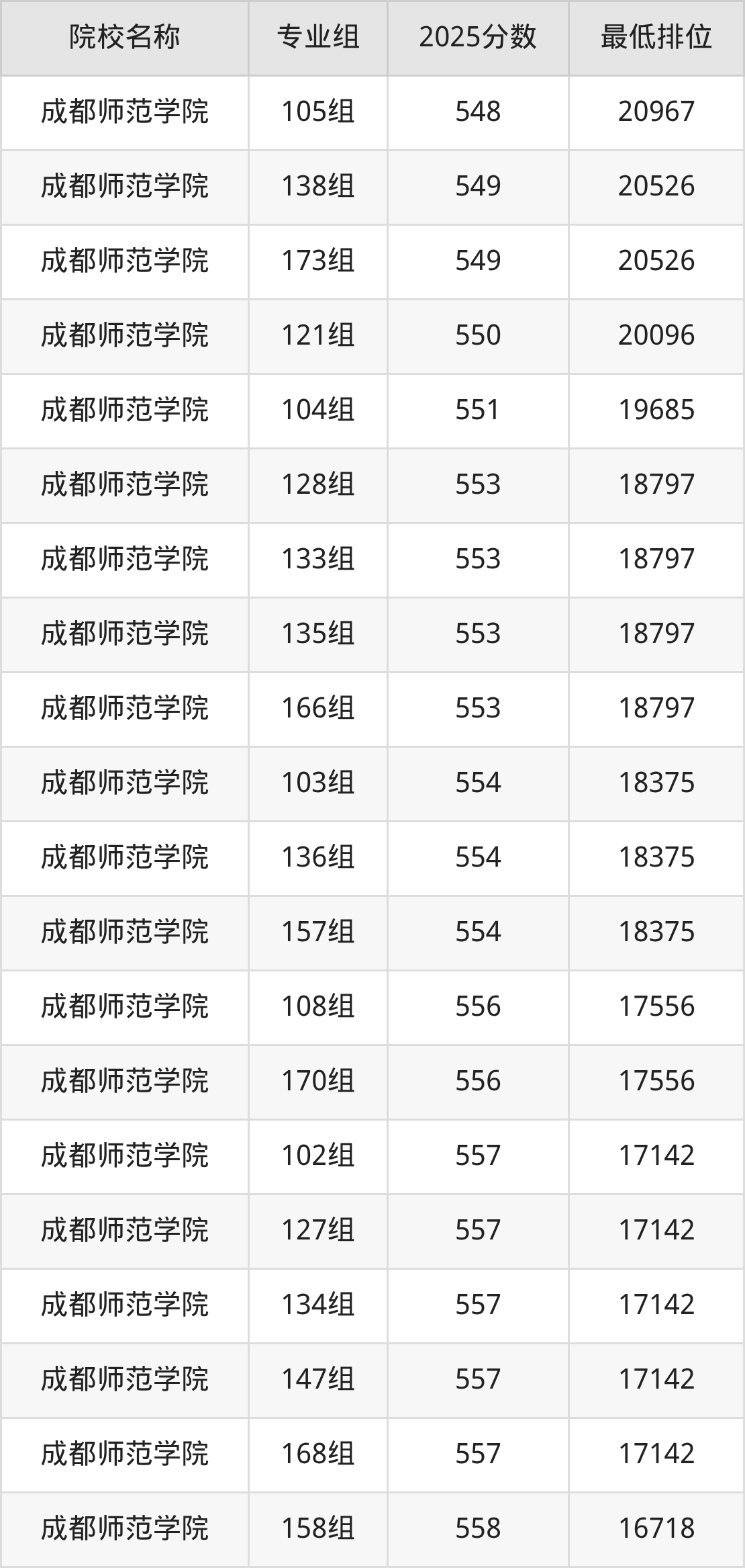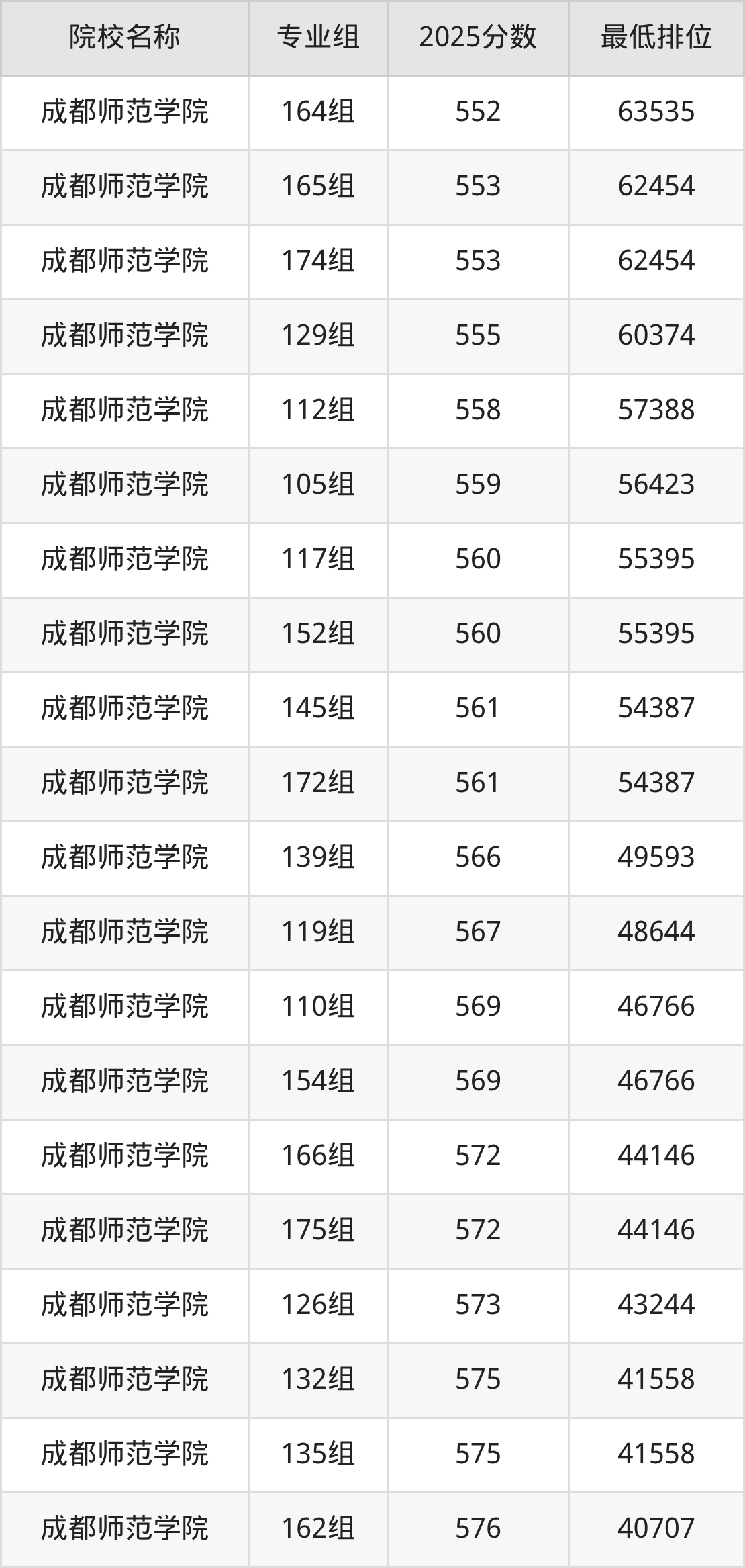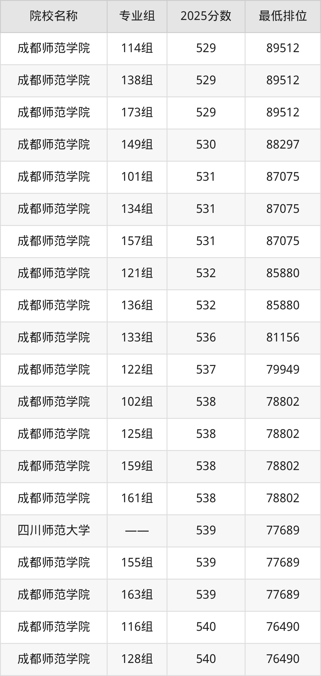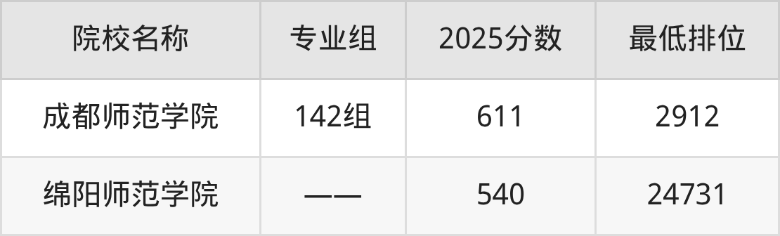 第三梯队(500分及以下):成都师范学院(110组是492分)、西华师范大学(495分)、乐山师范学院(500分)
