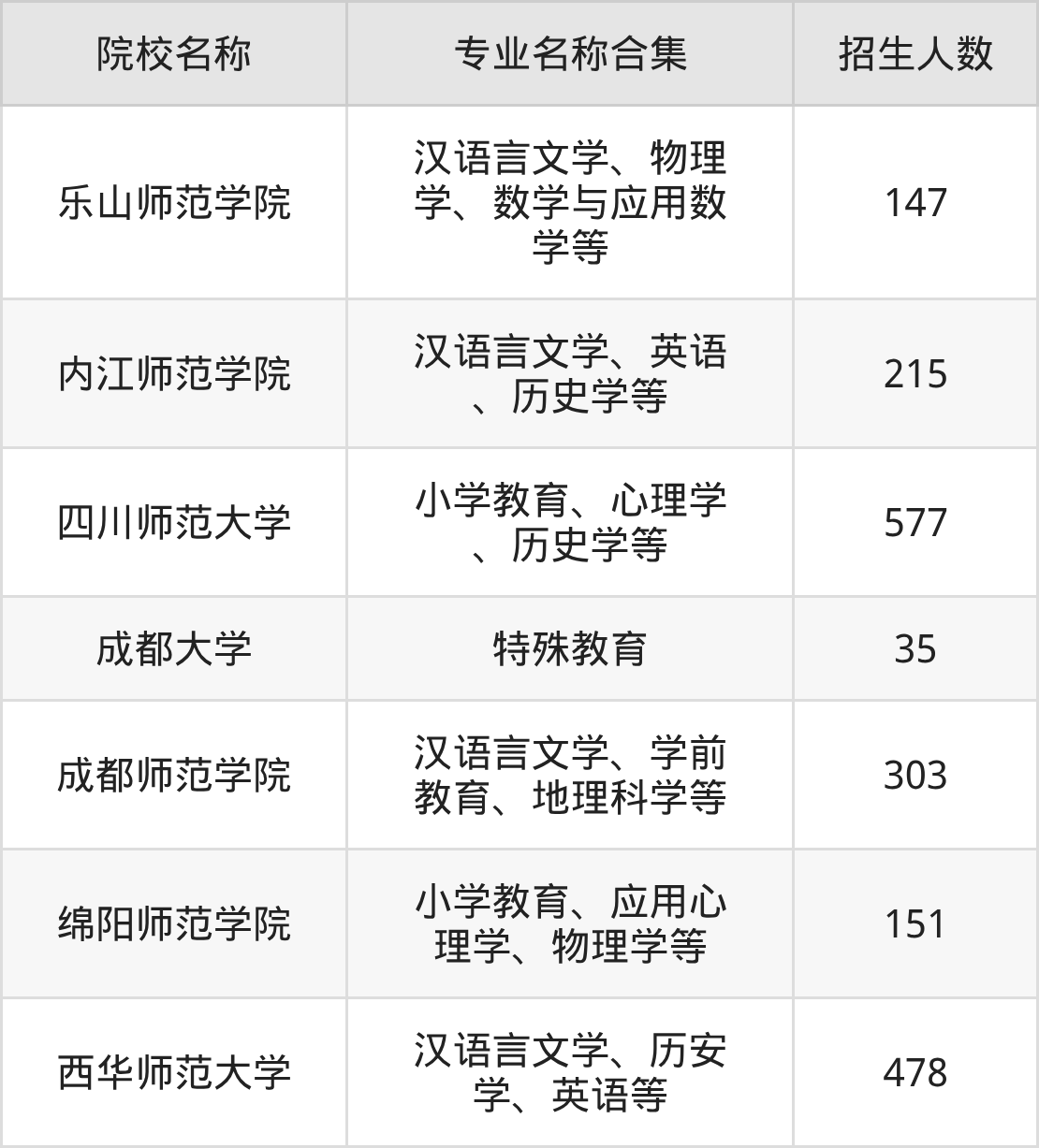 四川:乐山师范学院、内江师范学院、四川师范大学、成都大学、成都师范学院、绵阳师范学院、西华师范大学