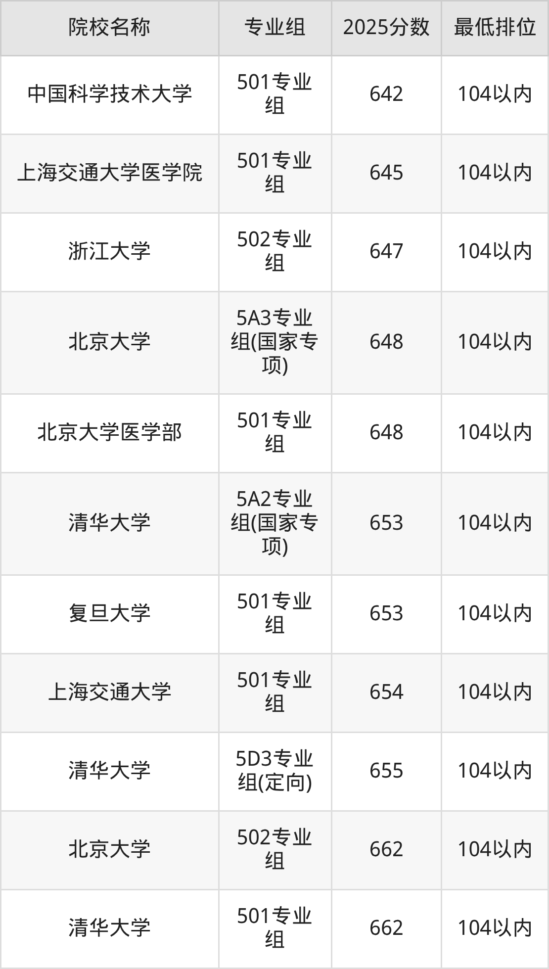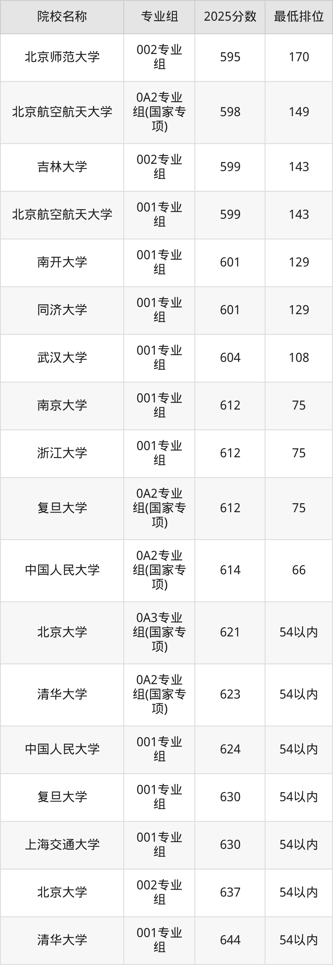 第一梯队(660分+):北京大学(502专业组是662分)、清华大学(501专业组是662分)