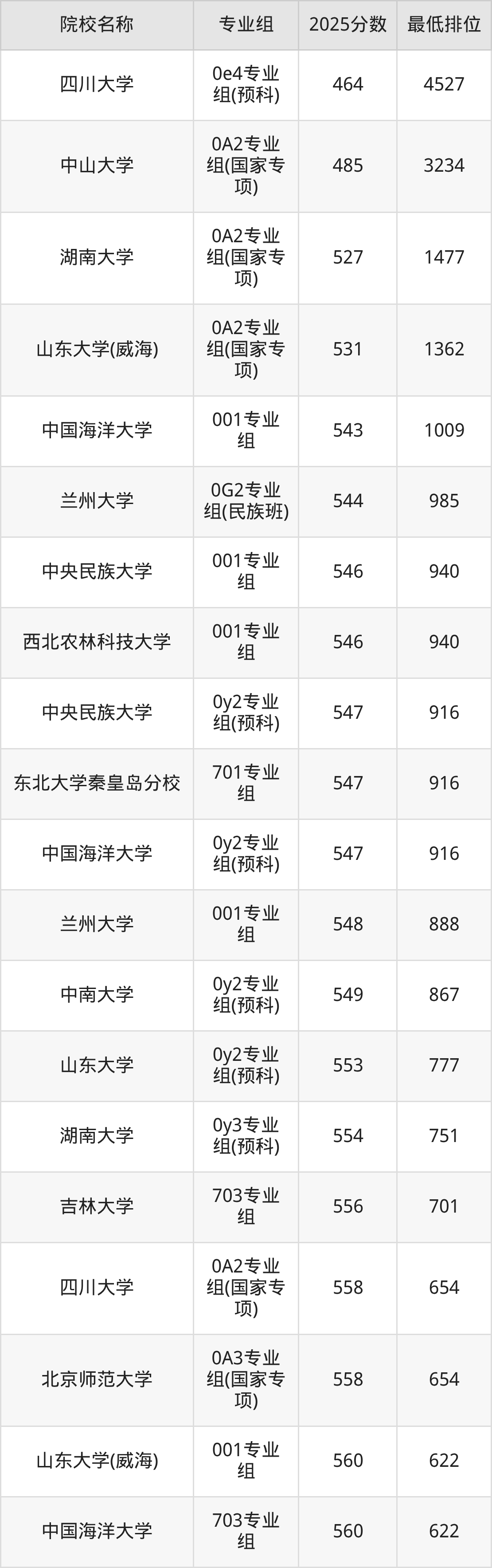 第二梯队(471-639分):中山大学(0A2专业组(国家专项)是485分)、湖南大学(0A2专业组(国家专项)是527分)、山东大学(威海)(0A2专业组(国家专项)是531分)、中国海洋大学(001专业组是543分)